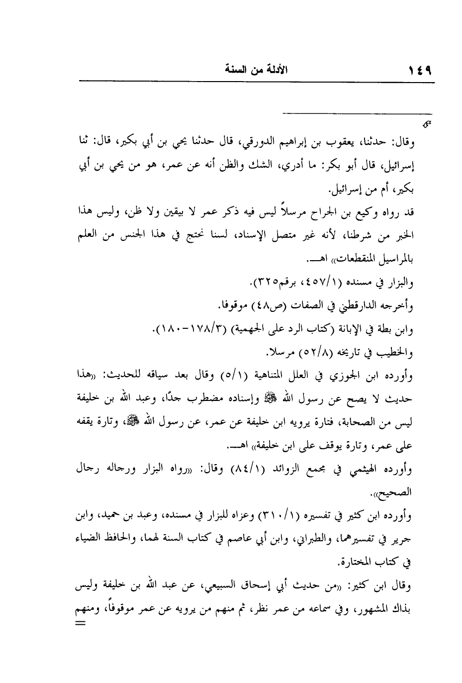 وقال: "وقد روى إسرائيل عن أبي إسحاق عن عبد الله بن خليفة أظنه عن عمر "- وذكره. وقال: حدثنا، يعقوب بن إبراهيم الدورقي، قال حدثنا يحي بن أبي بكير، قال: ثنا إسرائيل، قال أبو بكر: ما أدري، الشك والظن أنه عن عمر، هو من يحي بن أبي بكير، أم من إسرائيل. قد رواه وكيع بن الجراح مرسلاً ليس فيه ذكر عمر لا بيقين ولا ظن، وليس هذا الخبر من شرطنا، لأنه غير متصل الإسناد، لسنا نحتج في هذا الجنس من العلم بالمراسيل المنقطعات" اهـ. والبزار في مسنده (1/457، برقم325) .وأخرجه الدارقطني في الصفات (ص48) موقوفا. وابن بطة في الإبانة (كتاب الرد على الجهمية) (3/178-180) .والخطيب في تاريخه (8/52) مرسلا. وأورده ابن الجوزي في العلل المتناهية (1/5) وقال بعد سياقه للحديث: "هذا حديث لا يصح عن رسول الله صلى الله عليه وسلم وإسناده مضطرب جدًا، وعبد الله بن خليفة ليس من الصحابة، فتارة يرويه ابن خليفة عن عمر، عن رسول الله صلى الله عليه وسلم، وتارة يقفه على عمر، وتارة يوقف على ابن خليفة" اهـ. وأورده الهيثمي في مجمع الزوائد (1/84) وقال: "رواه البزار ورجاله رجال الصحيح".وأورده ابن كثير في تفسيره (1/310) وعزاه للبزار في مسنده، وعبد بن حميد، وابن جرير في تفسيرهما، والطبراني، وابن أبي عاصم في كتاب السنة لهما، والحافظ الضياء في كتاب المختارة. وقال ابن كثير: "من حديث أبي إسحاق السبيعي، عن عبد الله بن خليفة وليس بذاك المشهور، وفي سماعه من عمر نظر، ثم منهم من يرويه عن عمر موقوفاً، ومنهم