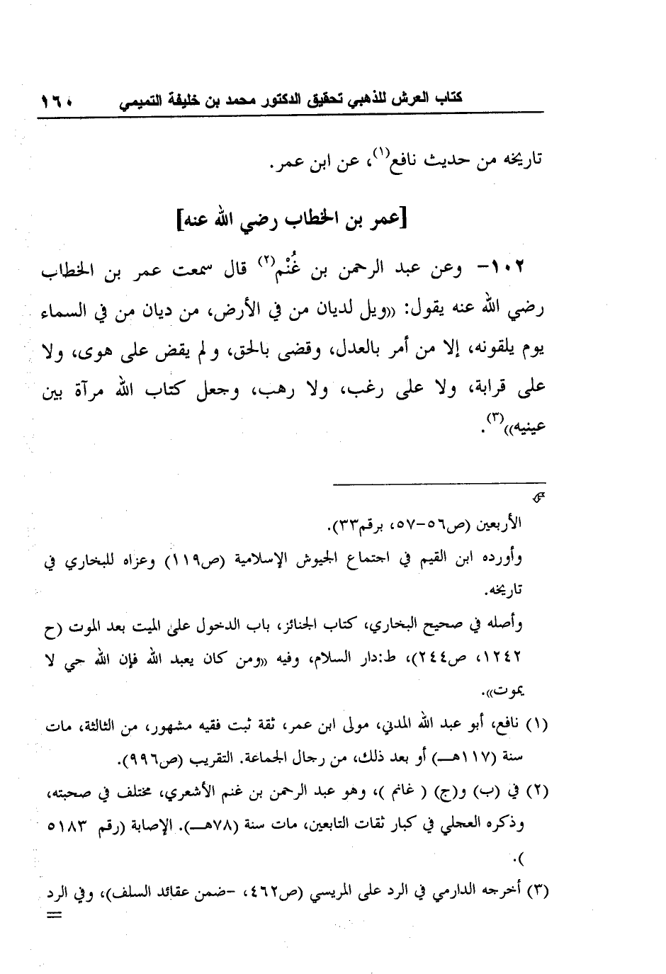 3 أخرجه الدارمي في الرد على المريسي (ص462، -ضمن عقائد السلف) ، وفي الرد على الجهمية (ص104) .وأورده ابن القيم في اجتماع الجيوش الإسلامية (ص120) ، وعزاه إلى أبي نعيم. وأورده الذهبي في العلو (ص63) ، وعزاه إلى سمويه في فوائده، من طريق الحافظ أبي نعيم بسنده الذي ذكره هنا، وقال أيضًا: "رواه بنحوه عقبة بن علقة البيروتي، عن سعيد بن عبد العزيز عالم أهل دمشق في عصر مالك، والليث، والحمادين".وقال الألباني: "إسناده صحيح". انظر مختصر العلو (ص103) .