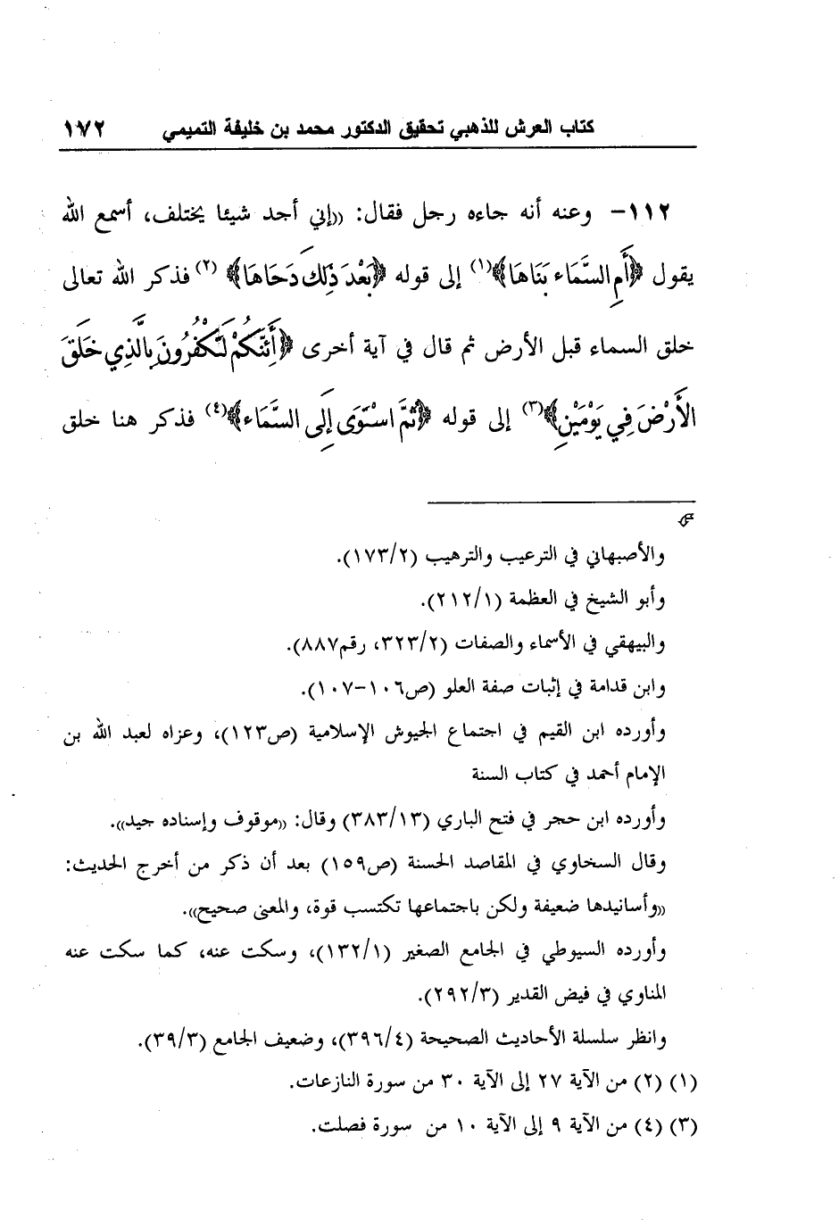 112- وعنه أنه جاءه رجل فقال: "إني أجد شيئا يختلف، أسمع الله يقول {أَمِ السَّمَاء بَنَاهَا} 1 إلى قوله {بَعْدَ ذَلِكَ دَحَاهَا} 2 فذكر الله تعالى خلق السماء قبل الأرض ثم قال في آية أخرى {أَئِنَّكُمْ لَتَكْفُرُونَ بِالَّذِي خَلَقَ الأَرْضَ فِي يَوْمَيْنِ} 3 إلى قوله {ثُمَّ اسْتَوَى إِلَى السَّمَاء} 4 فذكر هنا خلق