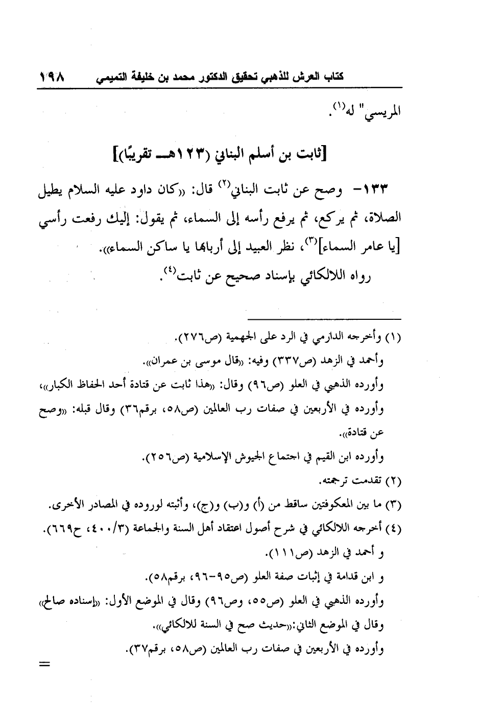 133- وصح عن ثابت البناني2 قال: كان داود عليه السلام يطيل الصلاة، ثم يركع، ثم يرفع رأسه إلى السماء، ثم يقول: إليك رفعت رأسي [يا عامر السماء] 3، نظر العبيد إلى أربابها يا ساكن السماء".