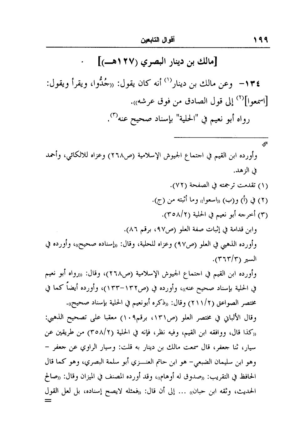 3 أخرجه أبو نعيم في الحلية (2/358) . وابن قدامة في إثبات صفة العلو (ص97، برقم 86) . وأورده الذهبي في العلو (ص97) وعزاه للحلية، وقال: "إسناده صحيح"، وأورده في السير (3/363) . وأورده ابن القيم في اجتماع الجيوش الإسلامية (ص268) ، وقال: "رواه أبو نعيم في الحلية بإسناد صحيح عنه"، وأورده في (ص132-133) ، وأورده أيضاً كما في مختصر الصواعق (2/211) وقال: "ذكره أبونعيم في الحلية بإسناد صحيح".