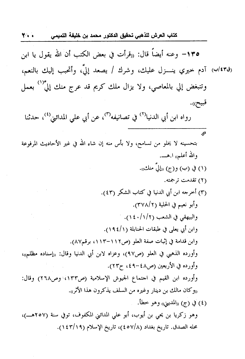 3 أخرجه ابن أبي الدنيا في كتاب الشكر (43) . وأبو نعيم في الحلية (2/378) . والبيهقي في الشعب (2/1/140) . وابن أبي يعلى في طبقات الحنابلة (1/194) . وابن قدامة في إثبات صفة العلو (ص112-113، برقم87) . وأورده الذهبي في العلو (ص97) ، وعزاه لابن أبي الدنيا وقال: "إسناده مظلم"، وأورده في الأربعين (ص48-49، ح23) . وأورده ابن القيم في اجتماع الجيوش الإسلامية (ص133، وص268) وقال: "وكان مالك بن دينار وغيره من السلف يذكرون هذا الأثر".