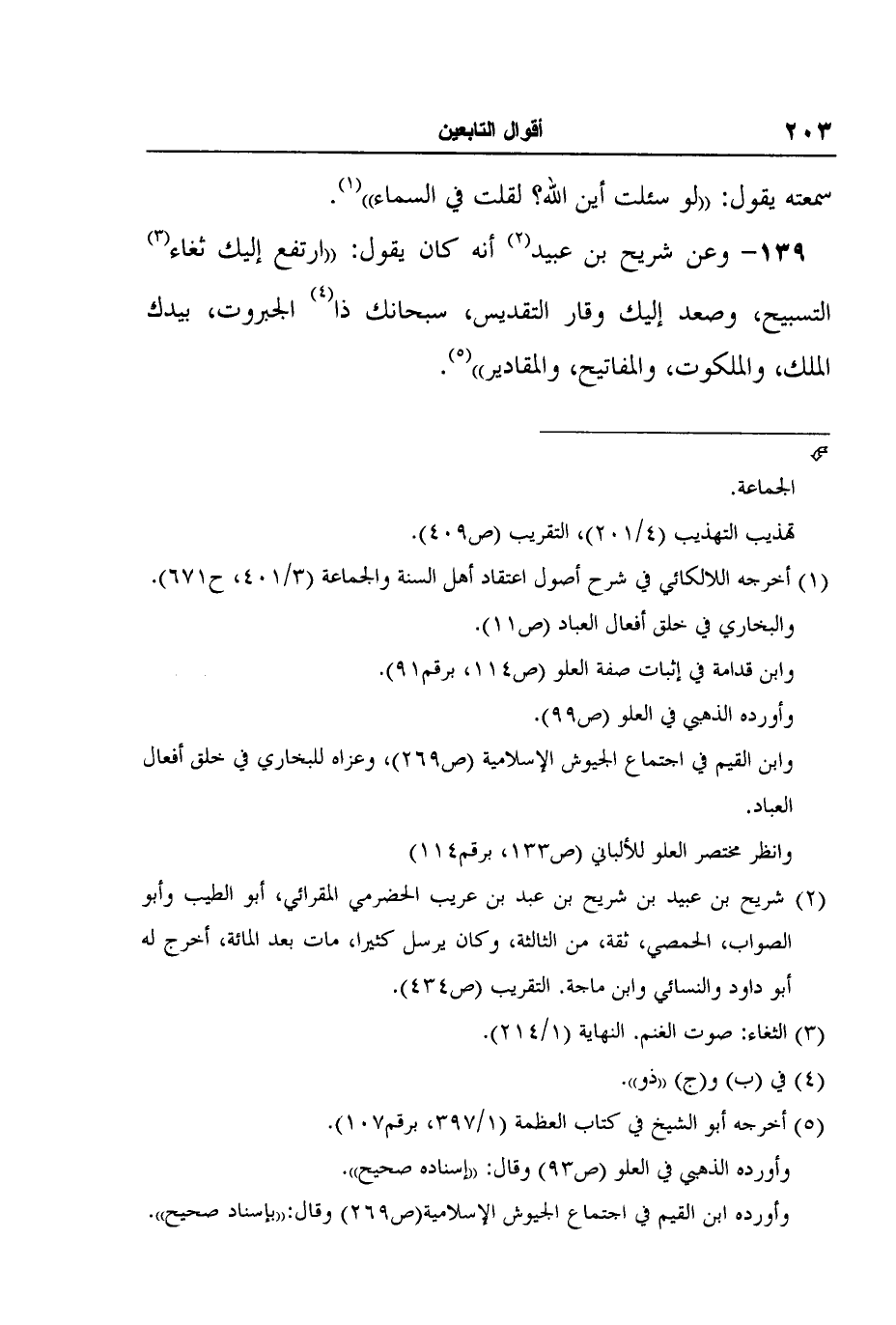 139- وعن شريح بن عبيد2 أنه كان يقول: ارتفع إليك ثغاء3 التسبيح، وصعد إليك وقار التقديس، سبحانك ذا4 الجبروت، بيدك الملك، والملكوت، والمفاتيح، والمقادير"5.