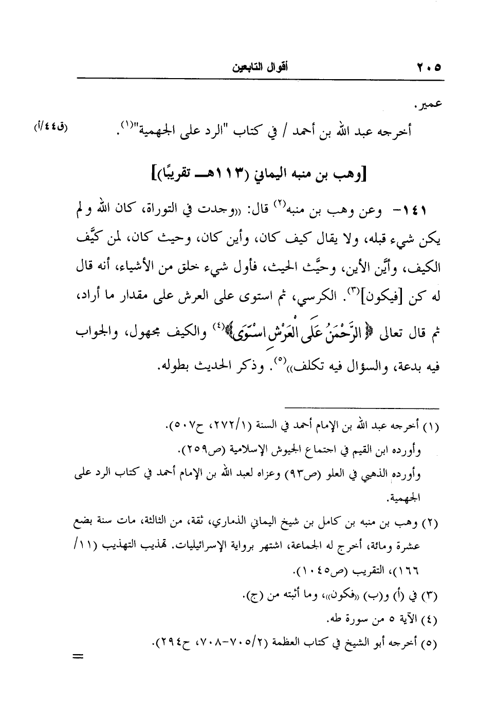 1 أخرجه عبد الله بن الإمام أحمد في السنة (1/272، ح507) . وأورده ابن القيم في اجتماع الجيوش الإسلامية (ص259) .وأورده الذهبي في العلو (ص93) وعزاه لعبد الله بن الإمام أحمد في كتاب الرد على الجهمية.