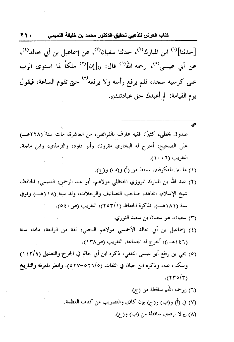[حدثنا] 1 ابن المبارك2، حدثنا سفيان3، عن إسماعيل بن أبي خالد4، عن أبي عيسى5، رحمه الله6 قال: [إن] 7 ملكاً لما استوى الرب على كرسيه سجد، فلم يرفع رأسه ولا يرفعه8 حتى تقوم الساعة، فيقول يوم القيامة: لم أعبدك حق عبادتك".