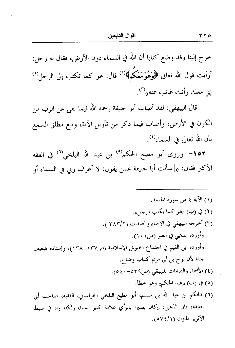 152- وروى أبو مطيع الحكم5 بن عبد الله البلخي6 في الفقه الأكبر فقال: " [سألت أبا حنيفة عمن يقول: لا أعرف ربي في السماء