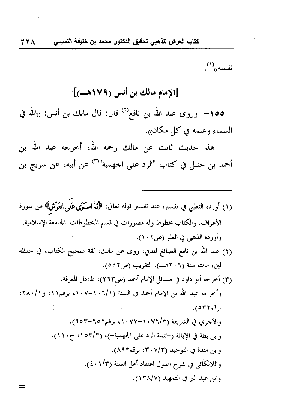 155- وروى عبد الله بن نافع2 قال: قال مالك بن أنس: "الله في السماء وعلمه في كل مكان".