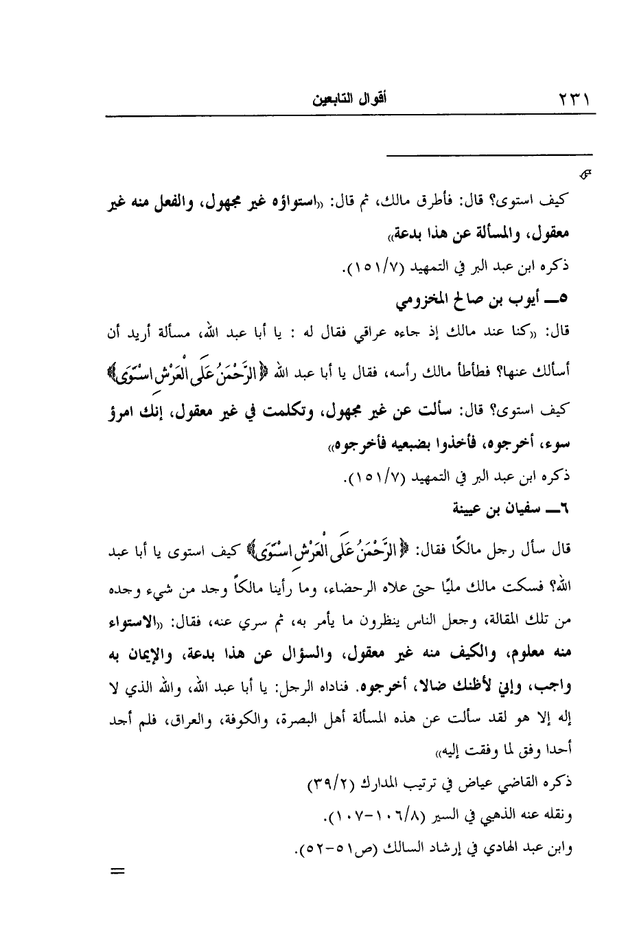 قال سأل رجل مالكًا فقال: {الرَّحْمَنُ عَلَى الْعَرْشِ اسْتَوَى} كيف استوى يا أبا عبد الله؟ فسكت مالك مليًا حتى علاه الرحضاء، وما رأينا مالكاً وجد من شيء وجده من تلك المقالة، وجعل الناس ينظرون ما يأمر به، ثم سري عنه، فقال: "الاستواء منه معلوم، والكيف منه غير معقول، والسؤال عن هذا بدعة، والإيمان به واجب، وإني لأظنك ضالا، أخرجوه. فناداه الرجل: يا أبا عبد الله، والله الذي لا إله إلا هو لقد سألت عن هذه المسألة أهل البصرة، والكوفة، والعراق، فلم أجد أحدا وفق لما وفقت إليه"