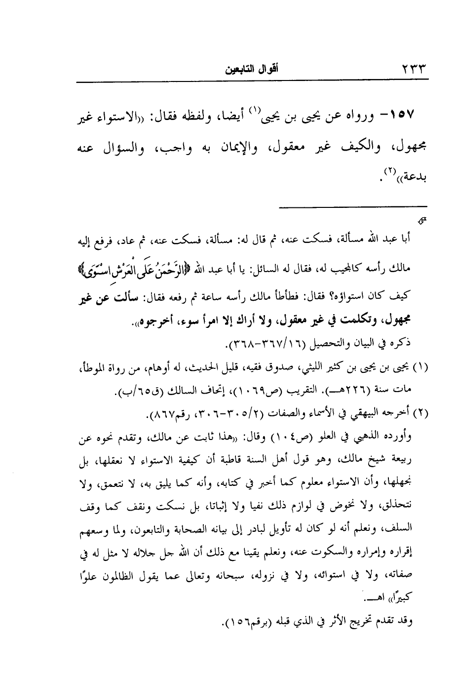 157- ورواه عن يحيى بن يحيى1 أيضا، ولفظه فقال: "الاستواء غير مجهول، والكيف غير معقول، والإيمان به واجب، والسؤال عنه بدعة"2.
