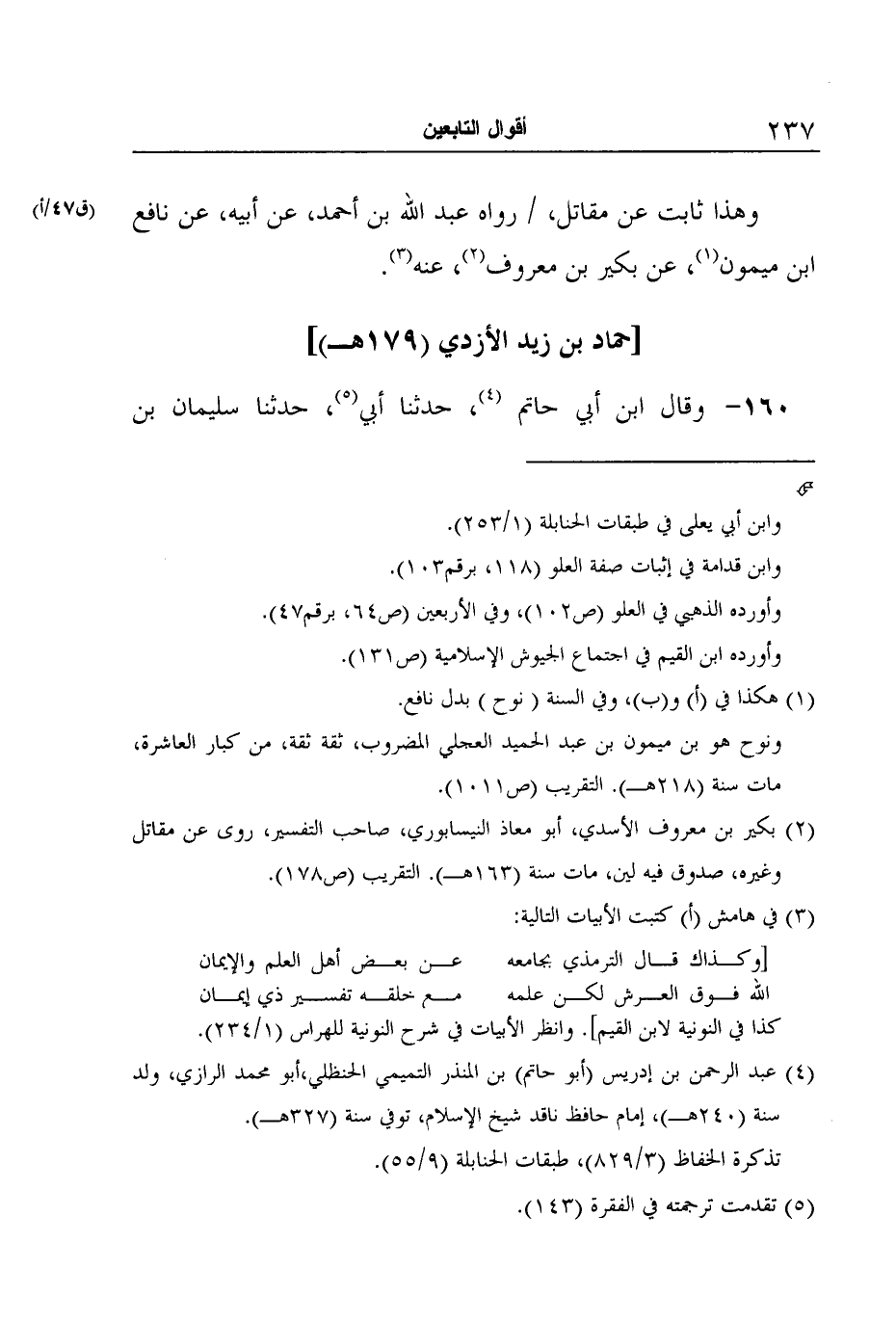 4 عبد الرحمن بن إدريس (أبو حاتم) بن المنذر التميمي الحنظلي، أبو محمد الرازي، ولد سنة (240هـ) ، إمام حافظ ناقد شيخ الإسلام، توفي سنة (327هـ) .