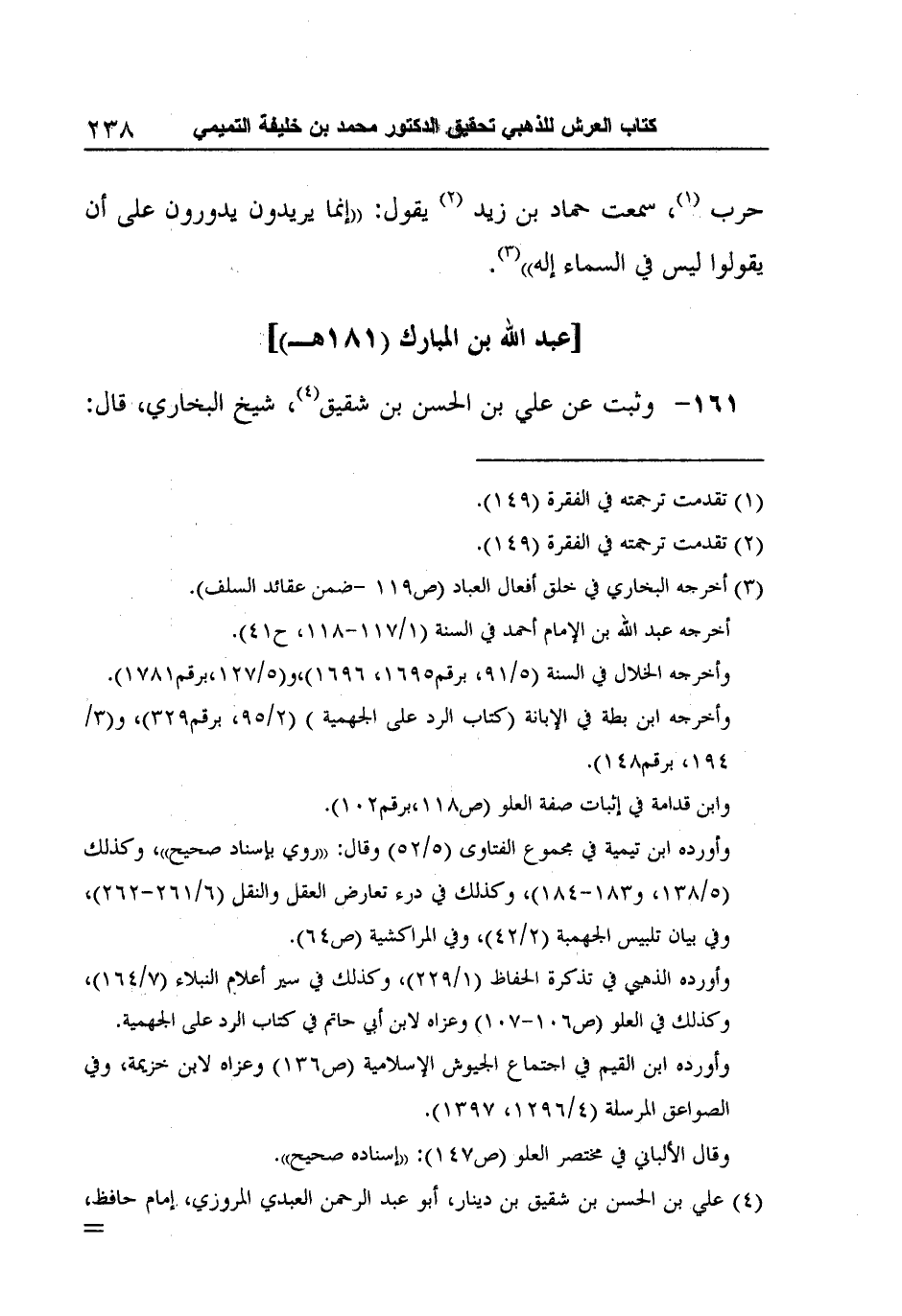 3 أخرجه البخاري في خلق أفعال العباد (ص119 -ضمن عقائد السلف) . أخرجه عبد الله بن الإمام أحمد في السنة (1/117-118، ح41) . وأخرجه الخلال في السنة (5/91، برقم1695، 1696) ،و (5/127،برقم1781) . وأخرجه ابن بطة في الإبانة (كتاب الرد على الجهمية) (2/95، برقم329) ، و (3/194، برقم148) . وابن قدامة في إثبات صفة العلو (ص118،برقم102) . وأورده ابن تيمية في مجموع الفتاوى (5/52) وقال: "روي بإسناد صحيح"، وكذلك (5/138، و183-184) ، وكذلك في درء تعارض العقل والنقل (6/261-262) ، وفي بيان تلبيس الجهمبة (2/42) ، وفي المراكشية (ص64) . وأورده الذهبي في تذكرة الحفاظ (1/229) ، وكذلك في سير أعلام النبلاء (7/164) ، وكذلك في العلو (ص106-107) وعزاه لابن أبي حاتم في كتاب الرد على الجهمية. وأورده ابن القيم في اجتماع الجيوش الإسلامية (ص136) وعزاه لابن خزيمة، وفي الصواعق المرسلة (4/1296، 1397) .