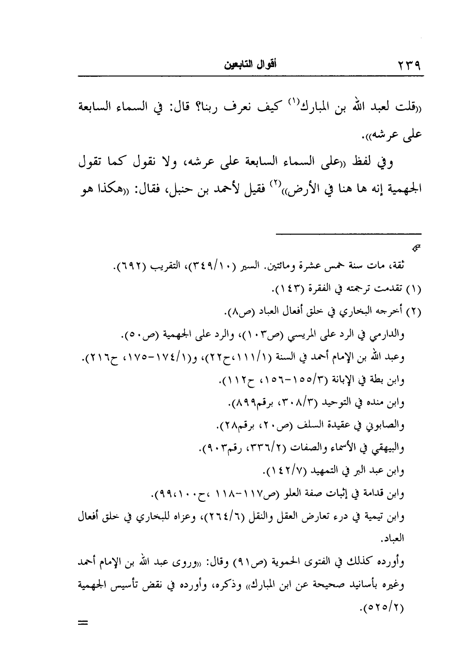 2 أخرجه البخاري في خلق أفعال العباد (ص8) . والدارمي في الرد على المريسي (ص103) ، والرد على الجهمية (ص50) . وعبد الله بن الإمام أحمد في السنة (1/111،ح22) ، و (1/174-175، ح216) . وابن بطة في الإبانة (3/155-156، ح112) . وابن منده في التوحيد (3/308، برقم899) . والصابوني في عقيدة السلف (ص20، برقم28) . والبيهقي في الأسماء والصفات (2/336، رقم903) . وابن عبد البر في التمهيد (7/142) . وابن قدامة في إثبات صفة العلو (ص117-118،ح99،100) . وابن تيمية في درء تعارض العقل والنقل (6/264) ، وعزاه للبخاري في خلق أفعال العباد. وأورده كذلك في الفتوى الحموية (ص91) وقال: "وروى عبد الله بن الإمام أحمد وغيره بأسانيد صحيحة عن ابن المبارك" وذكره، وأورده في نقض تأسيس الجهمية (2/525) . وأورده الذهبي في العلو (ص110) ، وفي سير أعلام النبلاء (8/402) ، وفي الأربعين في صفات رب العالمين (ص40، برقم10) . وأورده ابن القيم في اجتماع الجيوش الإسلامية (ص134-135) وقال: "روى الدارمي، والحاكم والبيهقي، وغيرهم، بأصح إسناد إلى علي بن الحسين بن شقيق" وذكره، وفي (ص213-214) وقال: "وقد صح عنه صحة قريبة من التواتر"، وعزاه للبيهقي، والحاكم، والدارمي. وأورده أيضاً في الصواعق كما في مختصر الصواعق (2/212) .