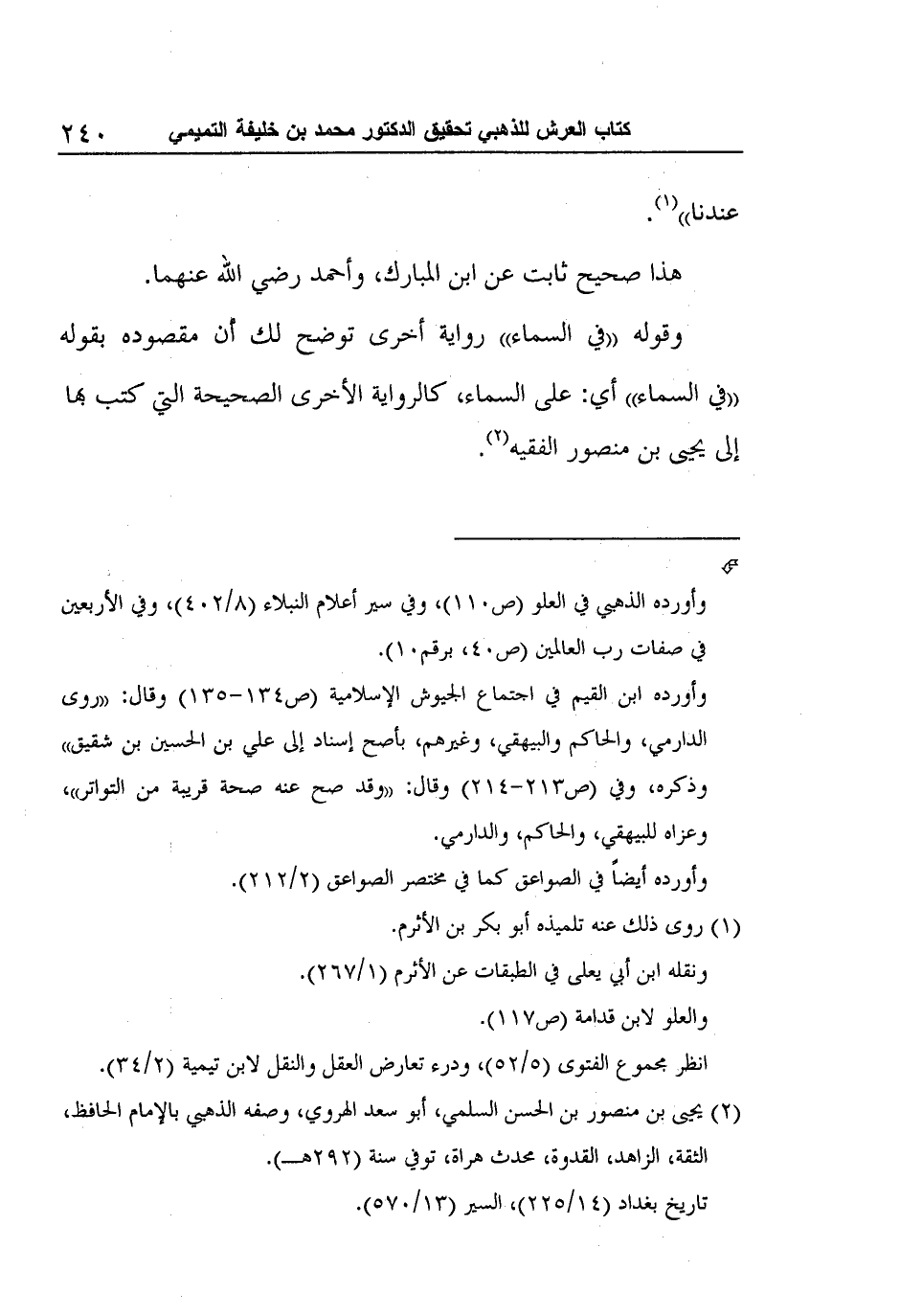 1 روى ذلك عنه تلميذه أبو بكر بن الأثرم. ونقله ابن أبي يعلى في الطبقات عن الأثرم (1/267) . والعلو لابن قدامة (ص117) . انظر مجموع الفتوى (5/52) ، ودرء تعارض العقل والنقل لابن تيمية (2/34) .