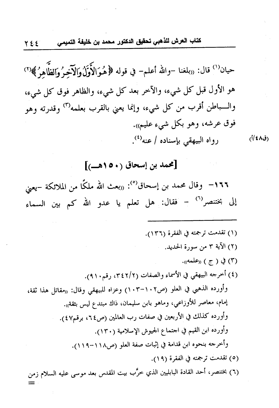 4 أخرجه البيهقي في الأسماء والصفات (2/342، رقم910) . وأورده الذهبي في العلو (ص102-103) وعزاه للبيهقي وقال: "مقاتل هذا ثقة، إمام، معاصر للأوزاعي، وماهو بابن سليمان، ذاك مبتدع ليس بثقة". وأورده كذلك في الأربعين في صفات رب العالمين (ص64، برقم47) . وأورده ابن القيم في اجتماع الجيوش الإسلامية (130) . وأخرجه بنحوه ابن قدامة في إثبات صفة العلو (ص118-119) .