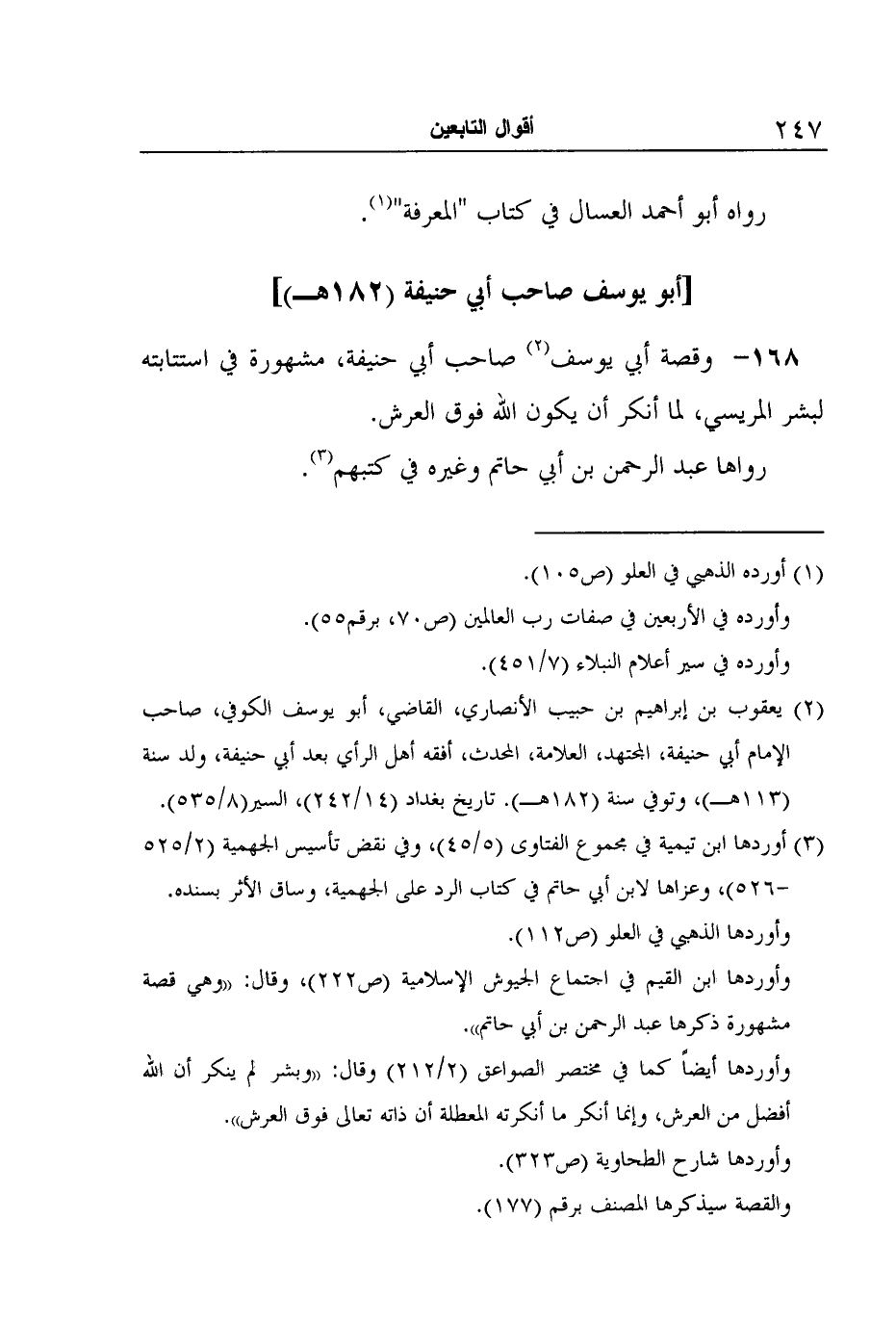 168- وقصة أبي يوسف2 صاحب أبي حنيفة، مشهورة في استتابته لبشر المريسي، لما أنكر أن يكون الله فوق العرش.