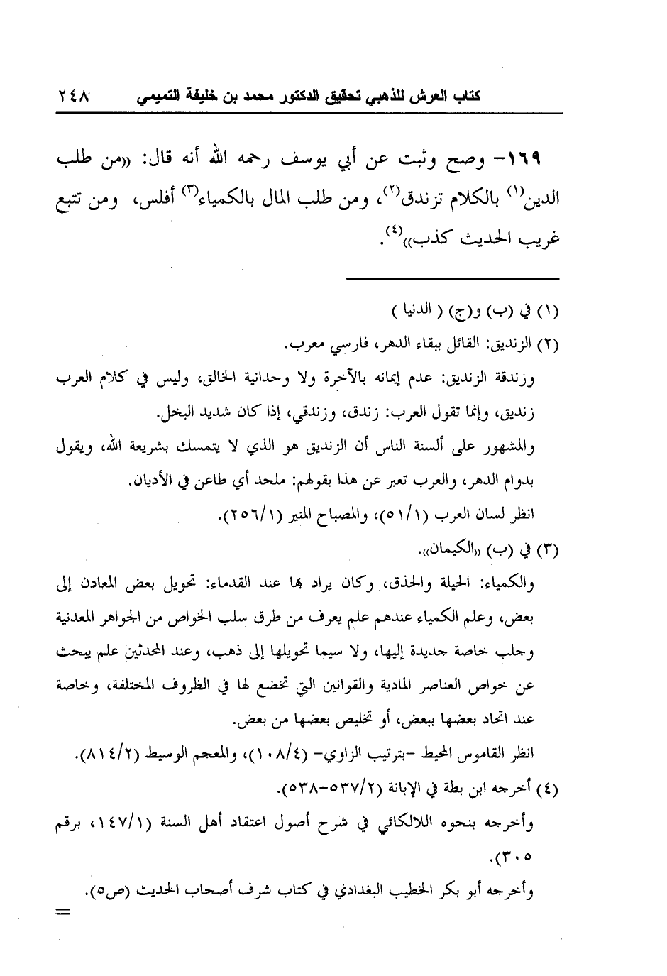 169- وصح وثبت عن أبي يوسف رحمه الله أنه قال: "من طلبالدين1 بالكلام تزندق2، ومن طلب المال بالكمياء3 أفلس، ومن تتبع