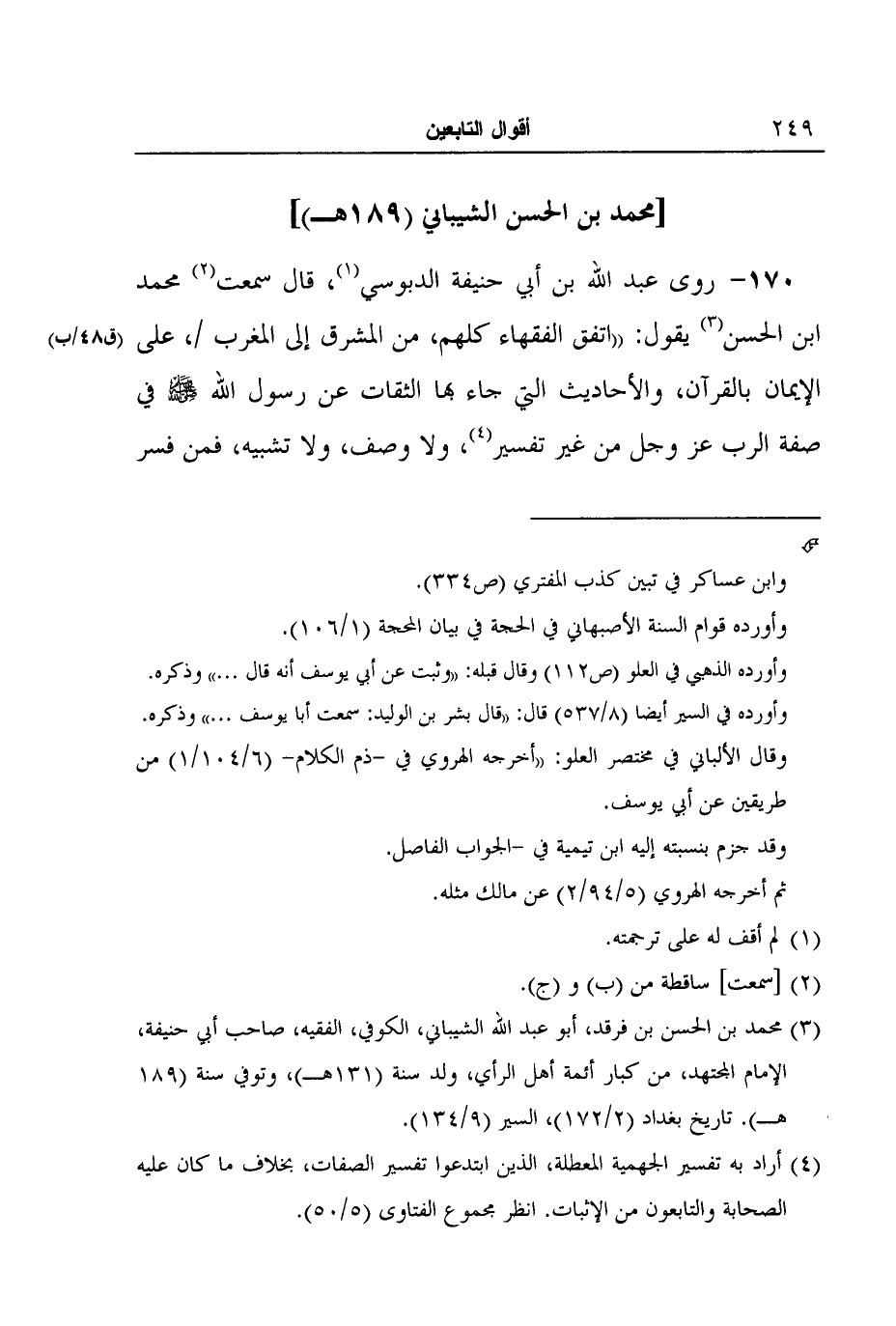 170- روى عبد الله بن أبي حنيفة الدبوسي1، قال سمعت2 محمد ابن الحسن3 يقول: "اتفق الفقهاء كلهم، من المشرق إلى المغرب (ق48/ب) ، على الإيمان بالقرآن، والأحاديث التي جاء بها الثقات عن رسول الله صلى الله عليه وسلم في صفة الرب عز وجل من غير تفسير4، ولا وصف، ولا تشبيه، فمن فسر
