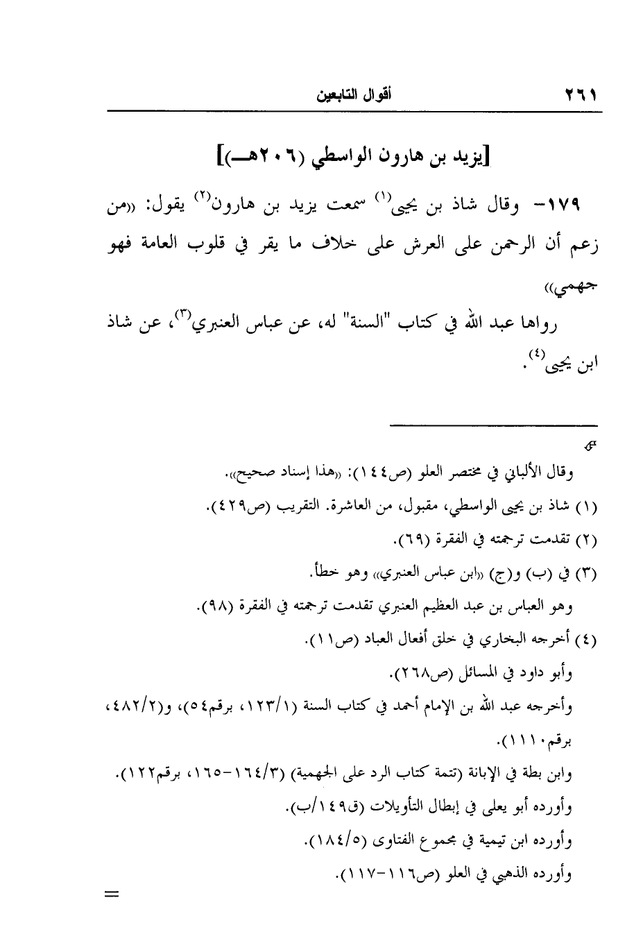 179- وقال شاذ بن يحيى1 سمعت يزيد بن هارون2 يقول: "من زعم أن الرحمن على العرش على خلاف ما يقر في قلوب العامة فهو جهمي"