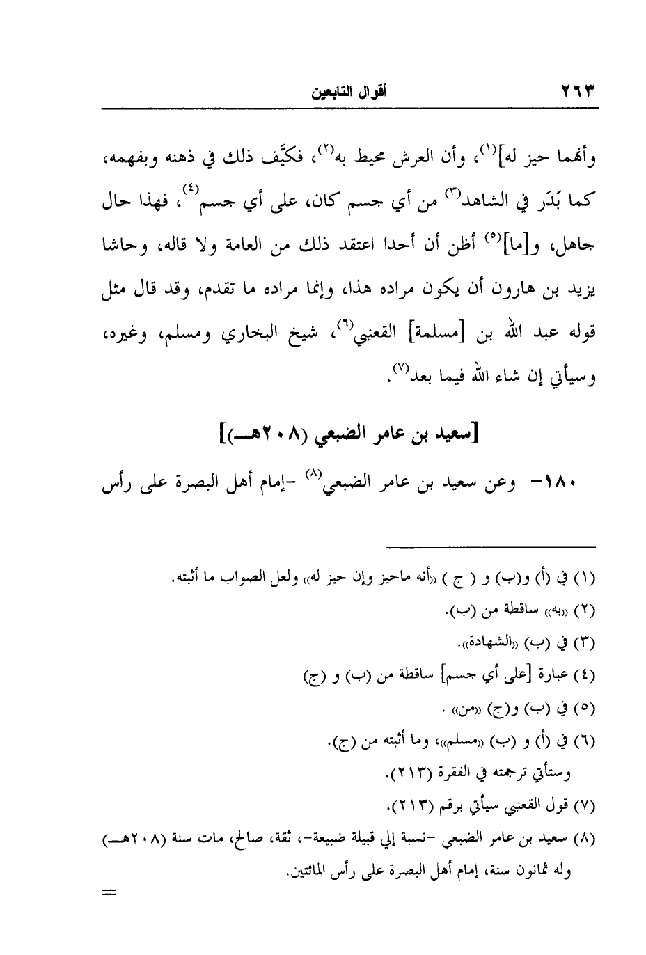 وأنهما حيز له] 1، وأن العرش محيط به2، فكيَّف ذلك في ذهنه وبفهمه، كما بَدَر في الشاهد3 من أي جسم كان، على أي جسم4، فهذا حال جاهل، و [ما] 5 أظن أن أحدا اعتقد ذلك من العامة ولا قاله، وحاشا يزيد بن هارون أن يكون مراده هذا، وإنما مراده ما تقدم، وقد قال مثل قوله عبد الله بن [مسلمة] القعنبي6، شيخ البخاري ومسلم، وغيره، وسيأتي إن شاء الله فيما بعد7.