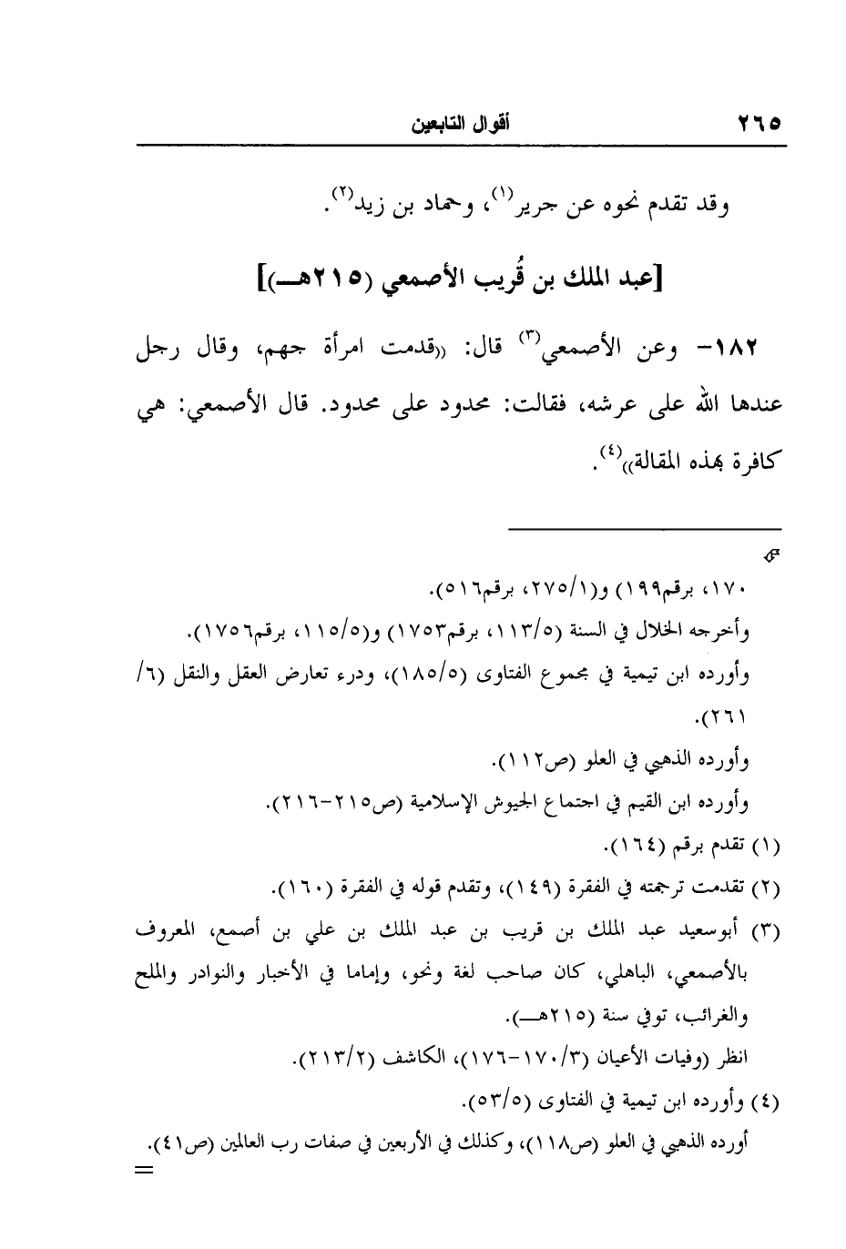 182- وعن الأصمعي3 قال: "قدمت امرأة جهم، وقال رجل عندها الله على عرشه، فقالت: محدود على محدود. قال الأصمعي: هي كافرة بهذه المقالة"4.