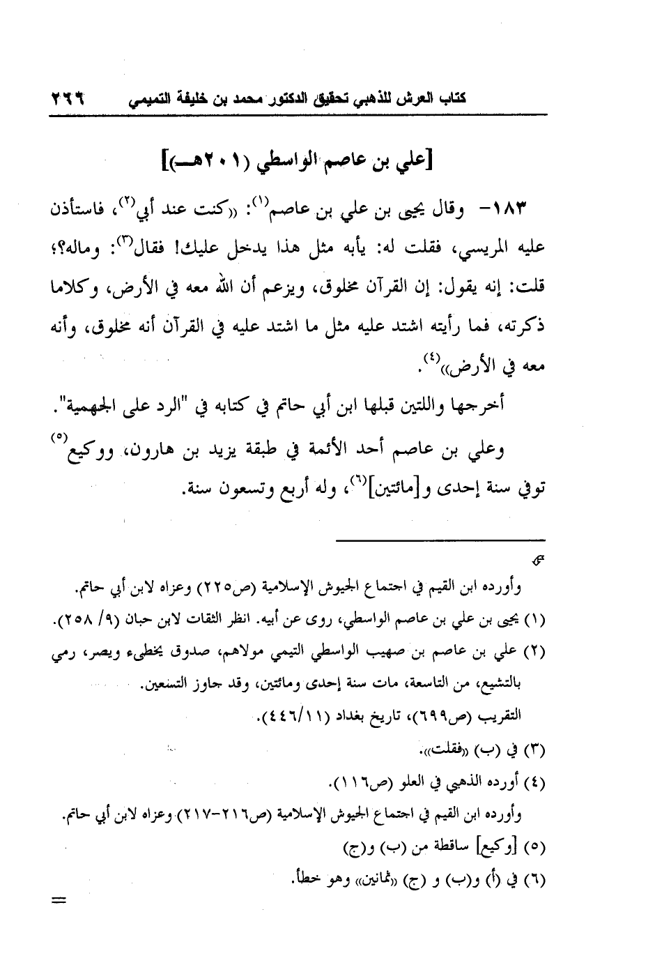 183- وقال يحيى بن علي بن عاصم1: "كنت عند أبي2، فاستأذن عليه المريسي، فقلت له: يأبه مثل هذا يدخل عليك! فقال3: وماله؟؛ قلت: إنه يقول: إن القرآن مخلوق، ويزعم أن الله معه في الأرض، وكلاما ذكرته، فما رأيته اشتد عليه مثل ما اشتد عليه في القرآن أنه مخلوق، وأنه معه في الأرض"4.