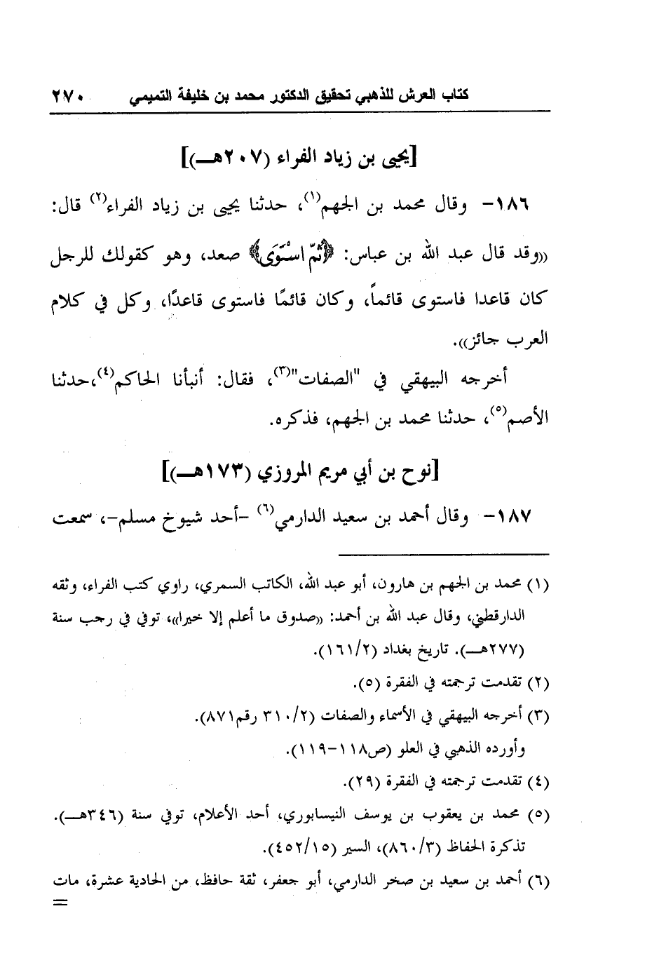 186- وقال محمد بن الجهم1، حدثنا يحيى بن زياد الفراء2 قال: "وقد قال عبد الله بن عباس: {ثُمّ اسْتَوَى} صعد، وهو كقولك للرجل كان قاعدا فاستوى قائماً، وكان قائمًا فاستوى قاعدًا، وكل في كلام العرب جائز".