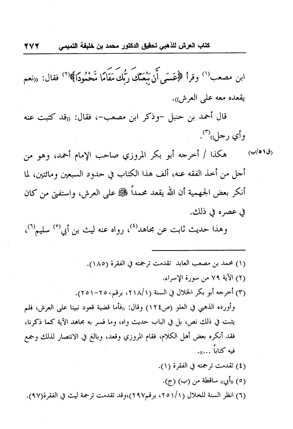 هكذا (ق51/ب) أخرجه أبو بكر المروزي صاحب الإمام أحمد، وهو من أجل من أخذ الفقه عنه، ألف هذا الكتاب في حدود السبعين ومائتين، لما أنكر بعض الجهمية أن الله يقعد محمداً صلى الله عليه وسلم على العرش، واستفتى من كان في عصره في ذلك.