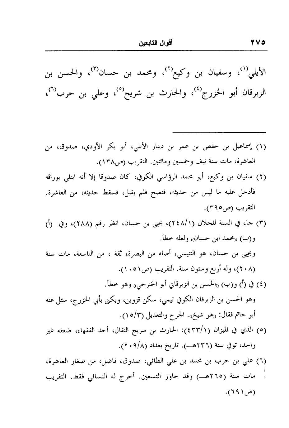 5 الذي في الميزان (1/433) : الحارث بن سريج النقال، أحد الفقهاء، ضعفه غير واحد، توفي سنة (236هـ) . تاريخ بغداد (8/209) .