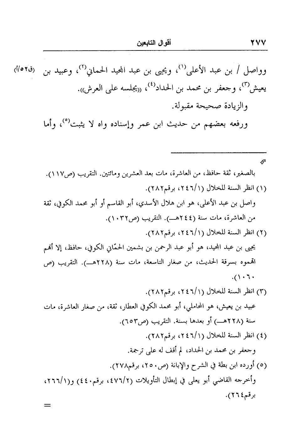 وواصل (ق52/أ) بن عبد الأعلى1، ويحيى بن عبد المجيد الحماني2، وعبيد بن يعيش3، وجعفر بن محمد بن الحداد4، "يجلسه على العرش".