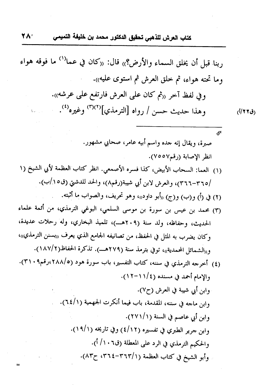 4 أخرجه الترمذي في سننه، كتاب التفسير، باب سورة هود (5/288،رقم3109) .والإمام أحمد في مسنده (4/11-12) .وابن أبي شيبة في العرش (ح7) . وابن ماجه في سننه، المقدمة، باب فيما أنكرت الجهمية (1/64) .وابن أبي عاصم في السنة (1/271) .وابن جرير الطبري في تفسيره (12/4) وفي تاريخه (1/19) .والحكيم الترمذي في الرد على المعطلة (ق106/ أ) .وأبو الشيخ في كتاب العظمة (1/363-364، ح83)