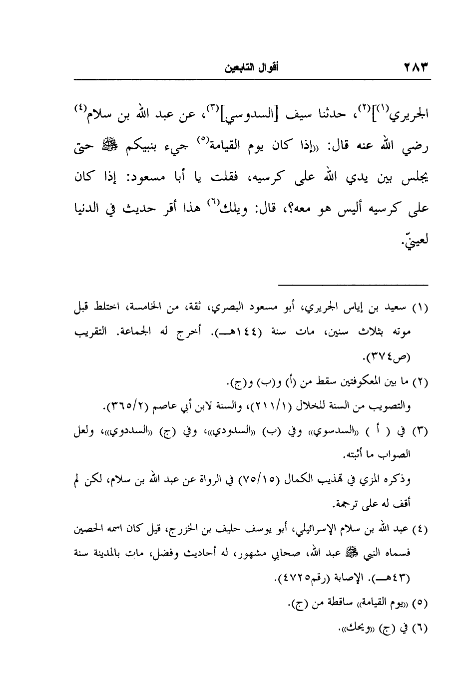 الجريري1] 2، حدثنا سيف [السدوسي] 3، عن عبد الله بن سلام4 رضي الله عنه قال: "إذا كان يوم القيامة5 جيء بنبيكم صلى الله عليه وسلم حتى يجلس بين يدي الله على كرسيه، فقلت يا أبا مسعود: إذا كان على كرسيه أليس هو معه؟، قال: ويلك6 هذا أقر حديث في الدنيا لعينيّ.