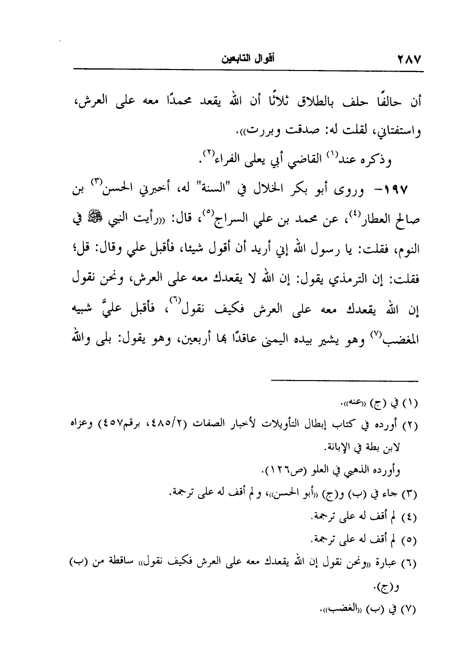 197- وروى أبو بكر الخلال في "السنة" له، أخبرني الحسن3 بن صالح العطار4، عن محمد بن علي السراج5، قال: "رأيت النبي صلى الله عليه وسلم في النوم، فقلت: يا رسول الله إني أريد أن أقول شيئا، فأقبل علي وقال: قل؛ فقلت: إن الترمذي يقول: إن الله لا يقعدك معه على العرش، ونحن نقول إن الله يقعدك معه على العرش فكيف نقول6، فأقبل عليَّ شبيه المغضب7 وهو يشير بيده اليمنى عاقدًا بها أربعين، وهو يقول: بلى والله