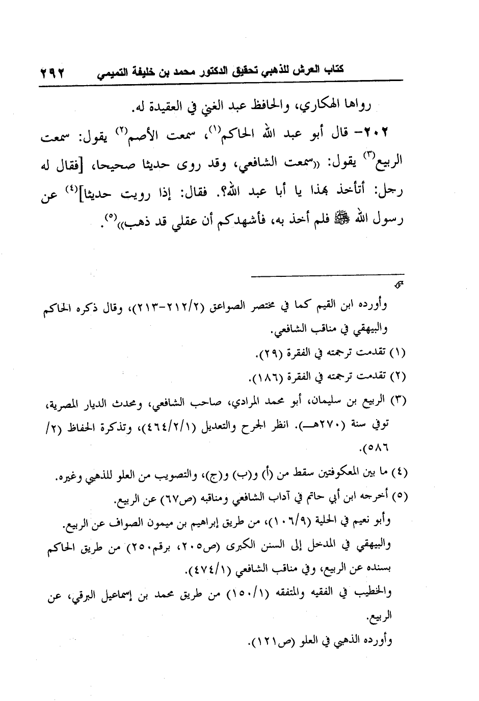 202- قال أبو عبد الله الحاكم1، سمعت الأصم2 يقول: سمعت الربيع3 يقول: "سمعت الشافعي، وقد روى حديثا صحيحا، [فقال له رجل: أتأخذ بهذا يا أبا عبد الله؟. فقال: إذا رويت حديثا] 4 عن رسول الله صلى الله عليه وسلم فلم أخذ به، فأشهدكم أن عقلي قد ذهب"5.