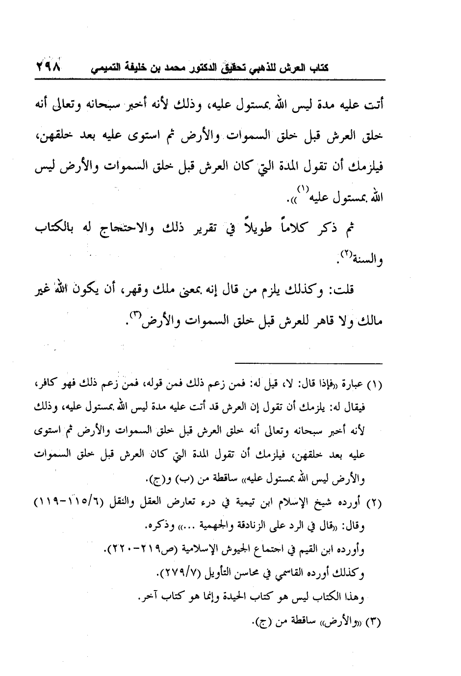 قلت: وكذلك يلزم من قال إنه بمعنى ملك وقهر، أن يكون الله غير مالك ولا قاهر للعرش قبل خلق السموات والأرض3.