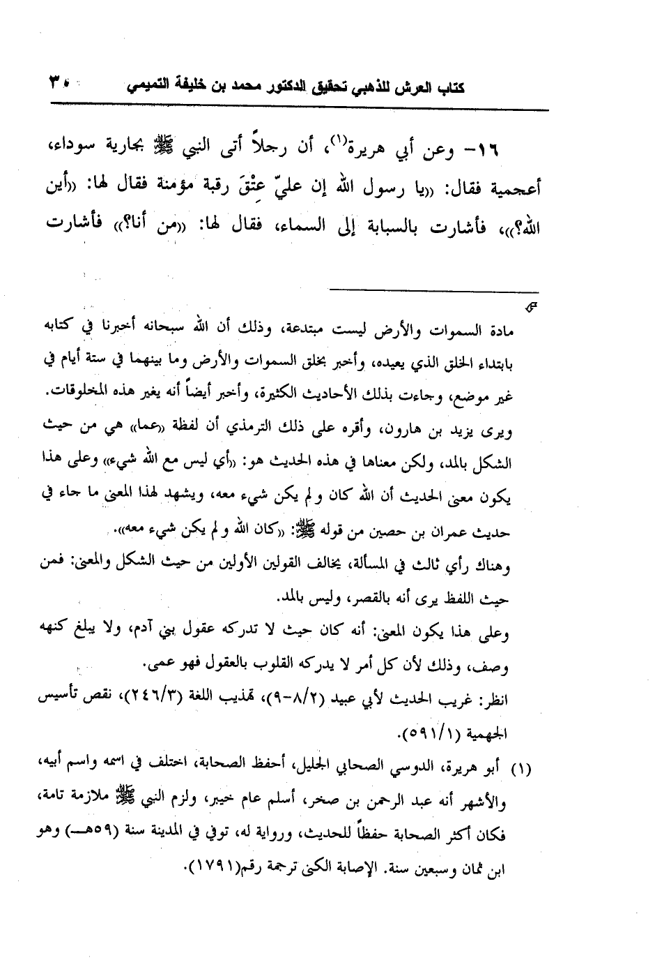 16- وعن أبي هريرة1، أن رجلاً أتى النبي صلى الله عليه وسلم بجارية سوداء، أعجمية فقال: "يا رسول الله إن عليّ عِتْقَ رقبة مؤمنة فقال لها: "أين الله؟ "، فأشارت بالسبابة إلى السماء، فقال لها: "من أنا؟ " فأشارت