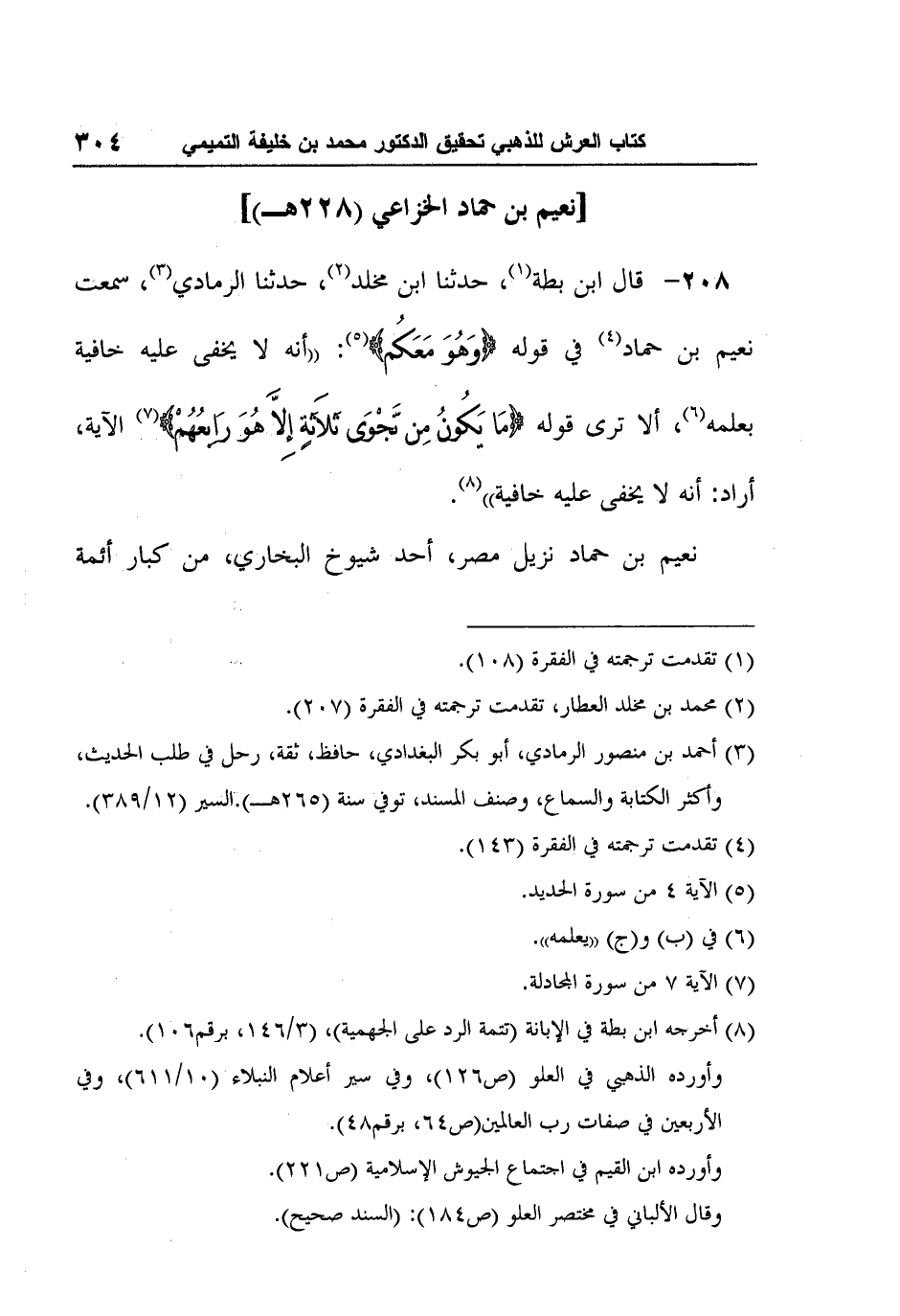 208- قال ابن بطة1، حدثنا ابن مخلد2، حدثنا الرمادي3، سمعت نعيم بن حماد4 في قوله {وَهُوَ مَعَكُم} 5: "أنه لا يخفى عليه خافية بعلمه6، ألا ترى قوله {مَا يَكُونُ مِن نَّجْوَى ثَلاَثَةٍ إِلاَّ هُوَ رَابِعُهُمْ} 7 الآية، أراد: أنه لا يخفى عليه خافية"8.
