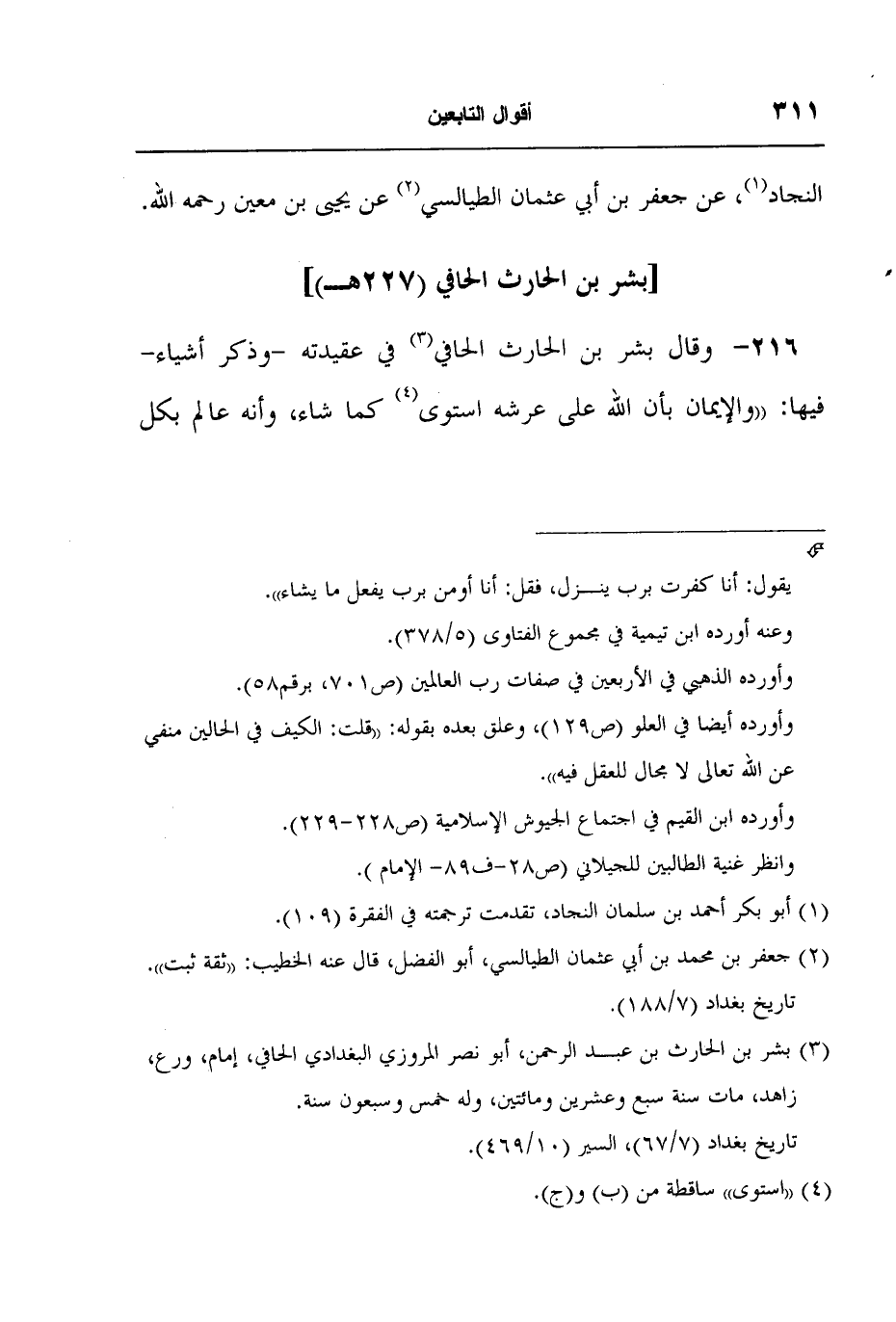 216- وقال بشر بن الحارث الحافي3 في عقيدته -وذكر أشياء- فيها: "والإيمان بأن الله على عرشه استوى4 كما شاء، وأنه عالم بكل