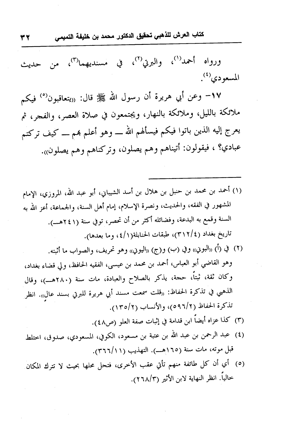 17- وعن أبي هريرة أن رسول الله صلى الله عليه وسلم قال: "يتعاقبون5 فيكم ملائكة بالليل، وملائكة بالنهار، ويجتمعون في صلاة العصر، والفجر، ثم يعرج إليه الذين باتوا فيكم فيسألهم الله ـ وهو أعلم بهم ـ كيف تركتم عبادي؟، فيقولون: أتيناهم وهم يصلون، وتركناهم وهم يصلون".