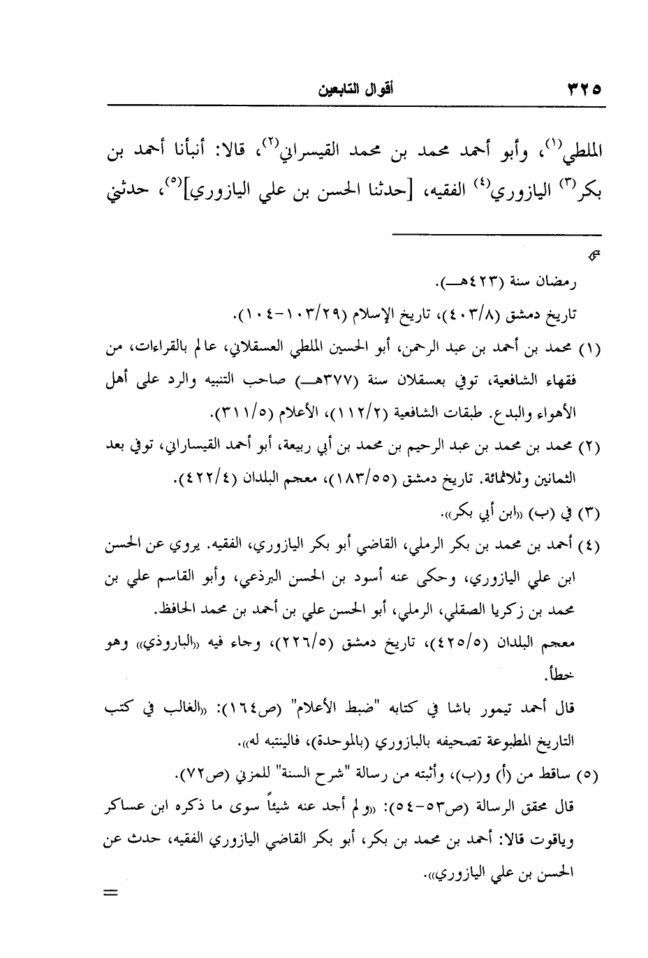 5 ساقط من (أ) و (ب) ، وأثبته من رسالة "شرح السنة" للمزني (ص72) . قال محقق الرسالة (ص53-54) : "ولم أجد عنه شيئاً سوى ما ذكره ابن عساكر وياقوت قالا: أحمد بن محمد بن بكر، أبو بكر القاضي اليازوري الفقيه، حدث عن الحسن بن علي اليازوري".كما وصف في السند أنه: "الحسن بن علي اليازوري الفقيه".