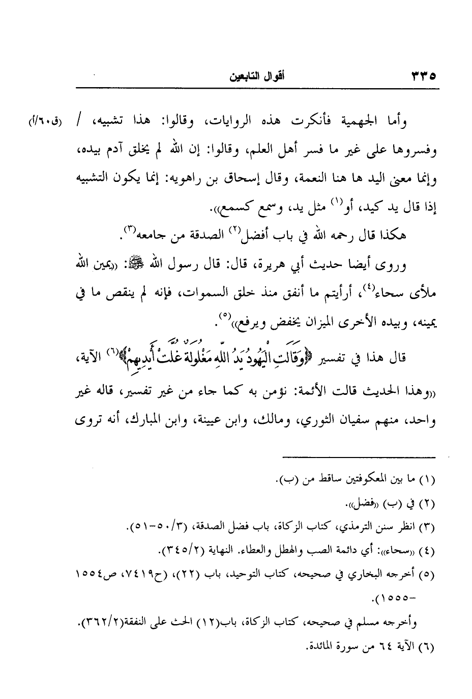 قال هذا في تفسير {وَقَالَتِ الْيَهُودُ يَدُ اللهِ مَغْلُولَةٌ غُلَّتْ أَيْدِيهِمْ} 6 الآية، "وهذا الحديث قالت الأئمة: نؤمن به كما جاء من غير تفسير، قاله غير واحد، منهم سفيان الثوري، ومالك، وابن عيينة، وابن المبارك، أنه تروى