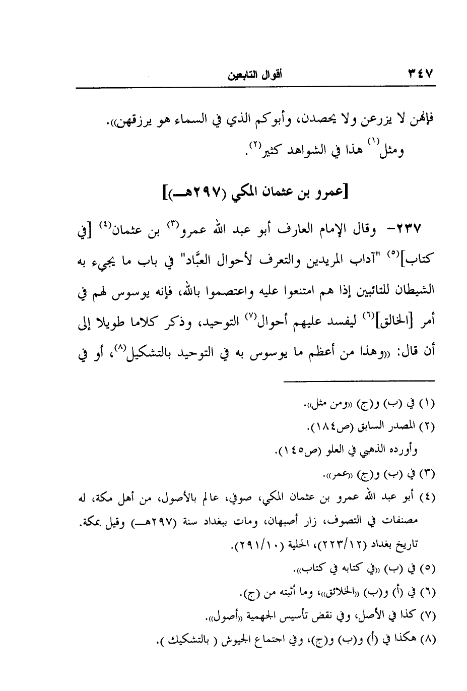 237- وقال الإمام العارف أبو عبد الله عمرو3 بن عثمان4 [في كتاب] 5 "آداب المريدين والتعرف لأحوال العبَّاد" في باب ما يجيء به الشيطان للتائبين إذا هم امتنعوا عليه واعتصموا بالله، فإنه يوسوس لهم في أمر [الخالق] 6 ليفسد عليهم أحوال7 التوحيد، وذكر كلاما طويلا إلى أن قال: "وهذا من أعظم ما يوسوس به في التوحيد بالتشكيل8، أو في