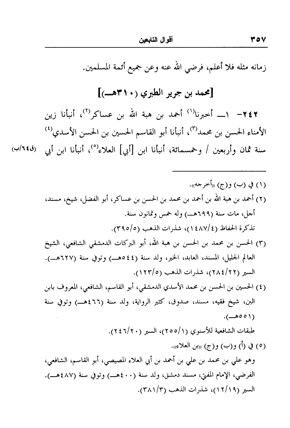 242- 1ـ أخبرنا1 أحمد بن هبة الله بن عساكر2، أنبأنا زين الأمناء الحسن بن محمد3، أنبأنا أبو القاسم الحسين بن الحسن الأسدي4 سنة ثمان وأربعين (ق64/ب) وخمسمائة، أنبأنا ابن [أبي] العلاء5، أنبأنا ابن