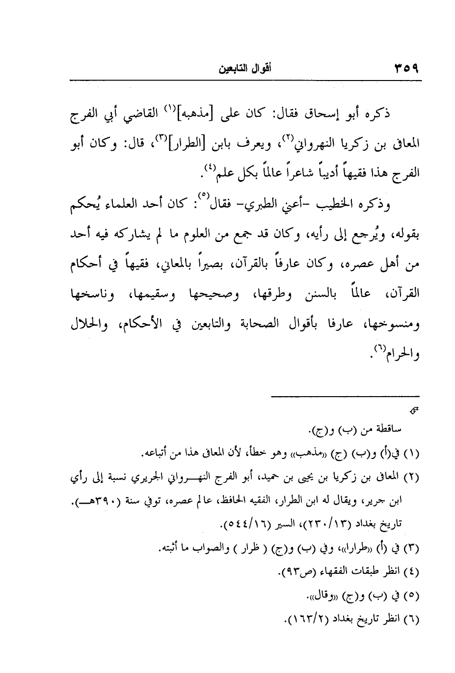2 المعافى بن زكريا بن يحيى بن حميد، أبو الفرج النهرواني الجريري نسبة إلى رأي ابن جرير، ويقال له ابن الطرار، الفقيه الحافظ، عالم عصره، توفي سنة (390هـ) . تاريخ بغداد (13/230) ، السير (16/544) .