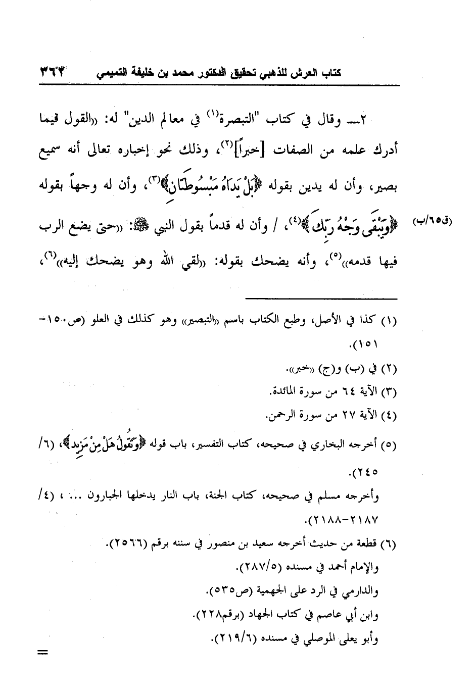 2ـ وقال في كتاب "التبصرة1 في معالم الدين" له: "القول فيما أدرك علمه من الصفات [خبراً] 2، وذلك نحو إخباره تعالى أنه سميع بصير، وأن له يدين بقوله {بَلْ يَدَاهُ مَبْسُوطَتَانِ} 3، وأن له وجهاً بقوله {وَيَبْقَى وَجْهُ رَبِّكَ} 4، (65/ب) وأن له قدماً بقول النبي صلى الله عليه وسلم: "حتى يضع الرب فيها قدمه"5، وأنه يضحك بقوله: "لقي الله وهو يضحك إليه"6،