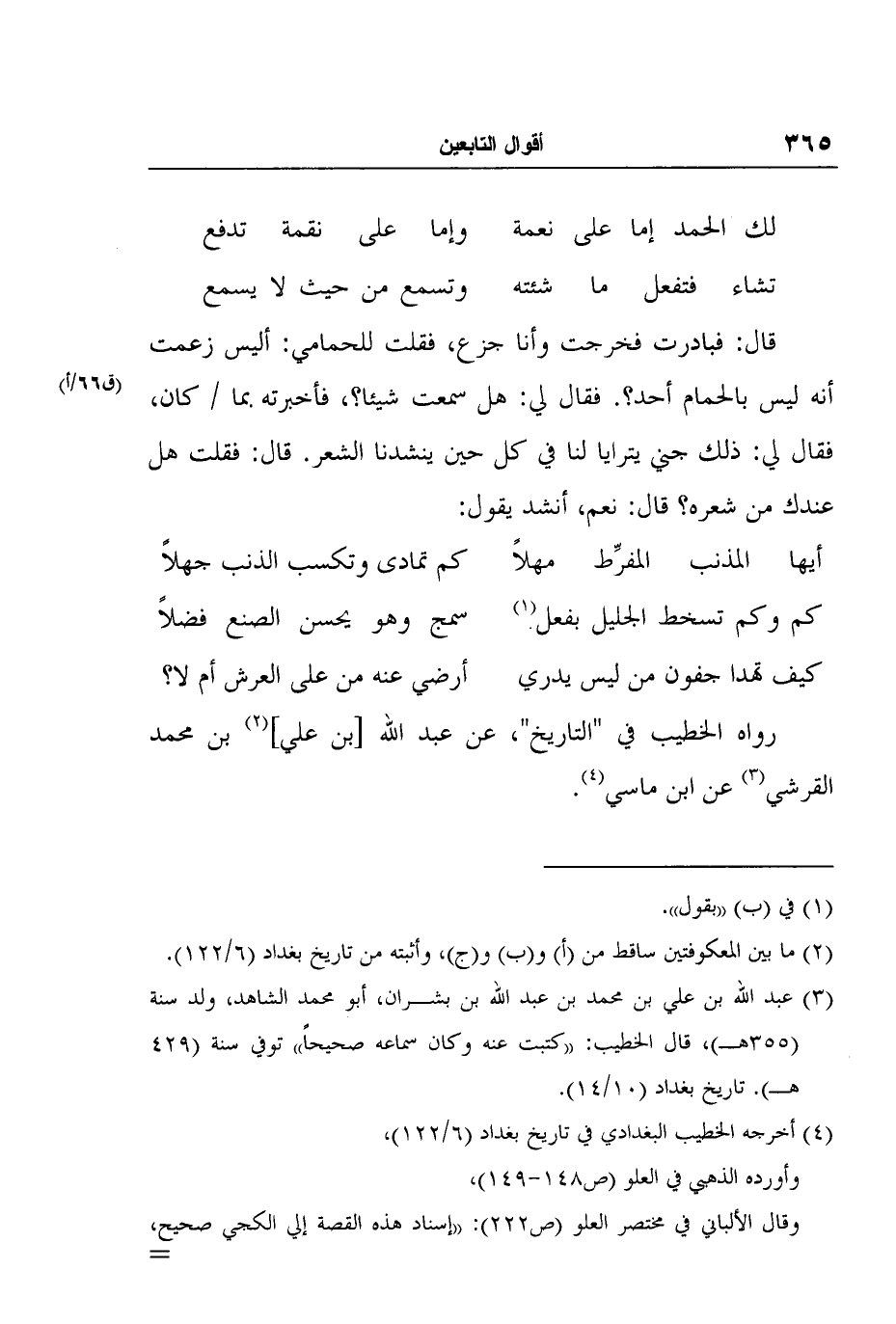 4 أخرجه الخطيب البغدادي في تاريخ بغداد (6/122) ، وأورده الذهبي في العلو (ص148-149) ،