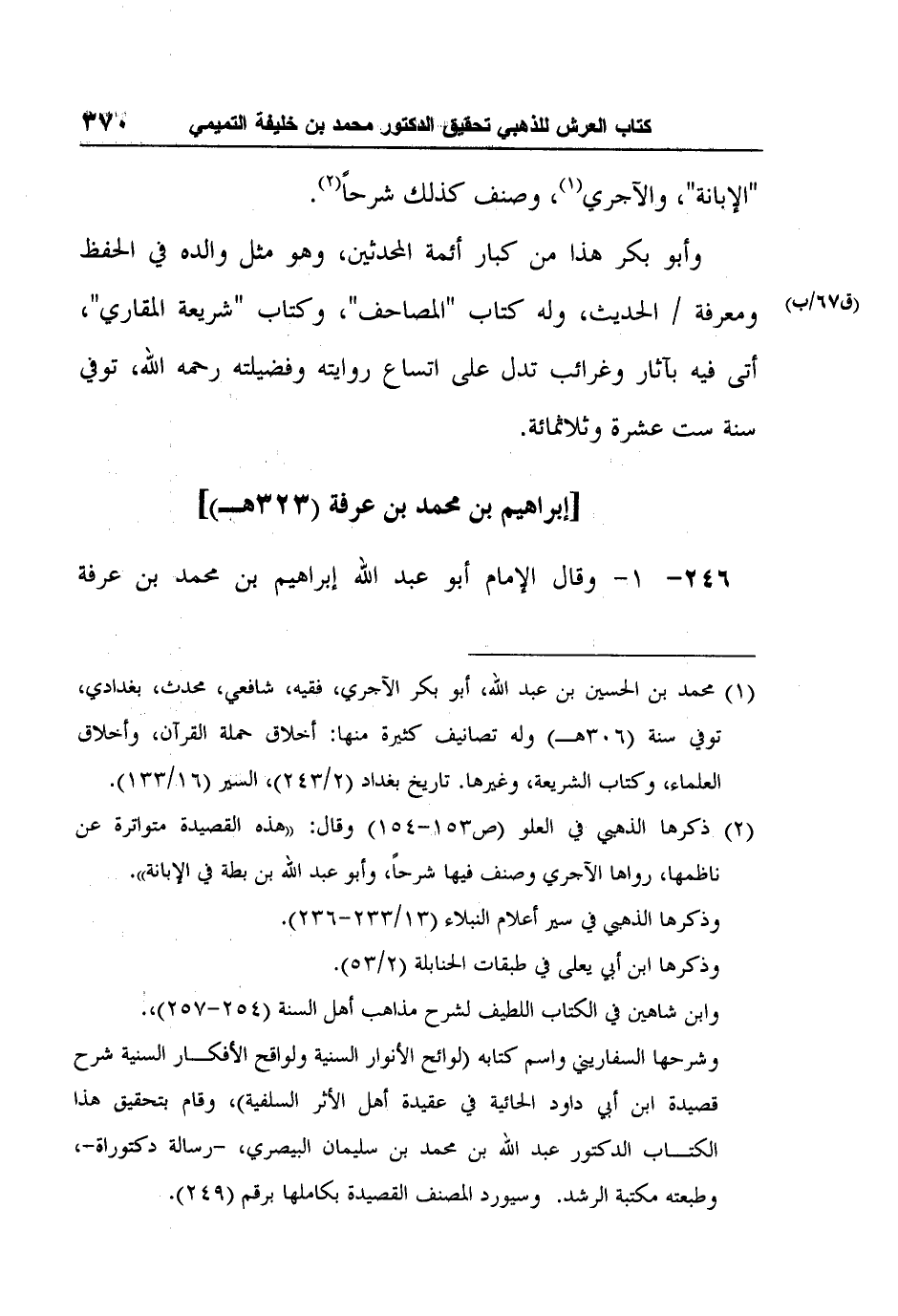 2 ذكرها الذهبي في العلو (ص153-154) وقال: "هذه القصيدة متواترة عن ناظمها، رواها الآجري وصنف فيها شرحاً، وأبو عبد الله بن بطة في الإبانة". وذكرها الذهبي في سير أعلام النبلاء (13/233-236) . وذكرها ابن أبي يعلى في طبقات الحنابلة (2/53) . وابن شاهين في الكتاب اللطيف لشرح مذاهب أهل السنة (254-257) ،. وشرحها السفاريني واسم كتابه (لوائح الأنوار السنية ولواقح الأفكار السنية شرح قصيدة ابن أبي داود الحائية في عقيدة أهل الأثر السلفية) ، وقام بتحقيق هذا الكتاب الدكتور عبد الله بن محمد بن سليمان البيصري، -رسالة دكتوراة-، وطبعته مكتبة الرشد. وسيورد المصنف القصيدة بكاملها برقم (249) .
