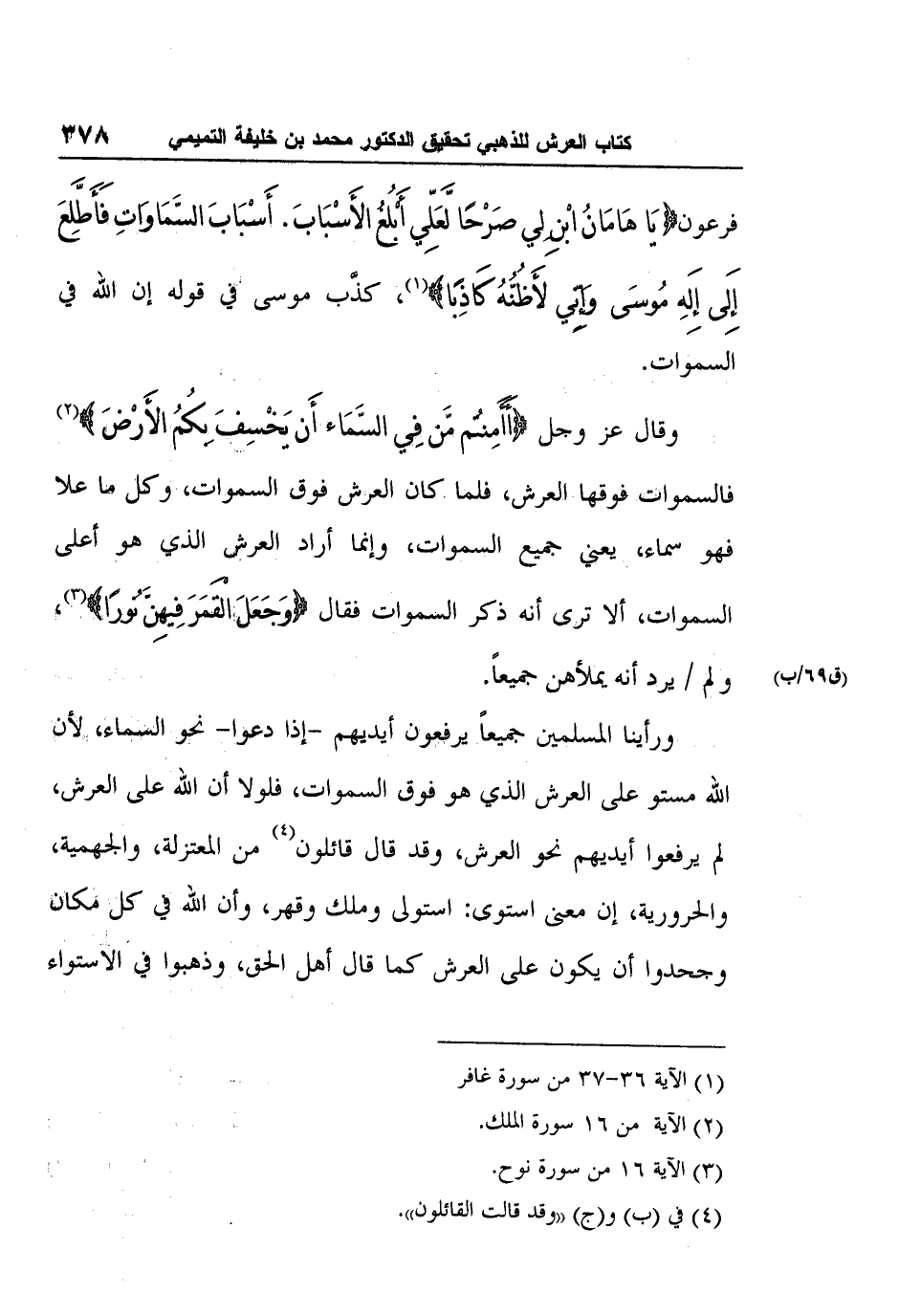وقال عز وجل {أَأَمِنتُم مَّن فِي السَّمَاء أَن يَخْسِفَ بِكُمُ الأَرْضَ} 2 فالسموات فوقها العرش، فلما كان العرش فوق السموات، وكل ما علا فهو سماء، يعني جميع السموات، وإنما أراد العرش الذي هو أعلى السموات، ألا ترى أنه ذكر السموات فقال {وَجَعَلَ الْقَمَرَ فِيهِنَّ نُورًا} 3، ولم (ق69/ب) يرد أنه يملأهن جميعاً.
