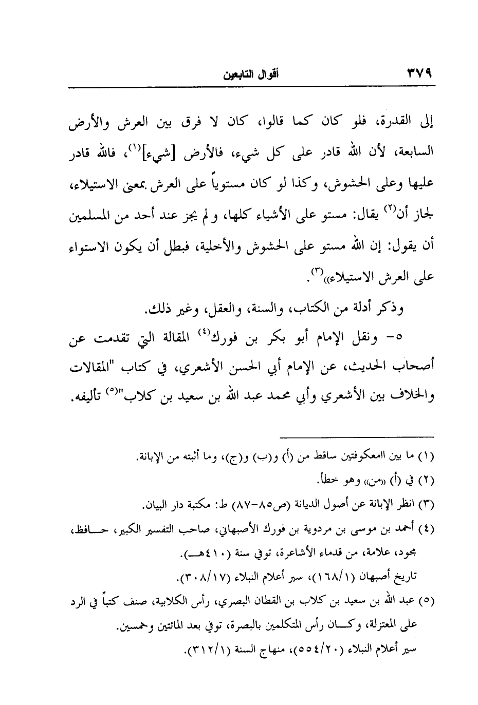 5- ونقل الإمام أبو بكر بن فورك4 المقالة التي تقدمت عن أصحاب الحديث، عن الإمام أبي الحسن الأشعري، في كتاب "المقالات والخلاف بين الأشعري وأبي محمد عبد الله بن سعيد بن كلاب"5 تأليفه