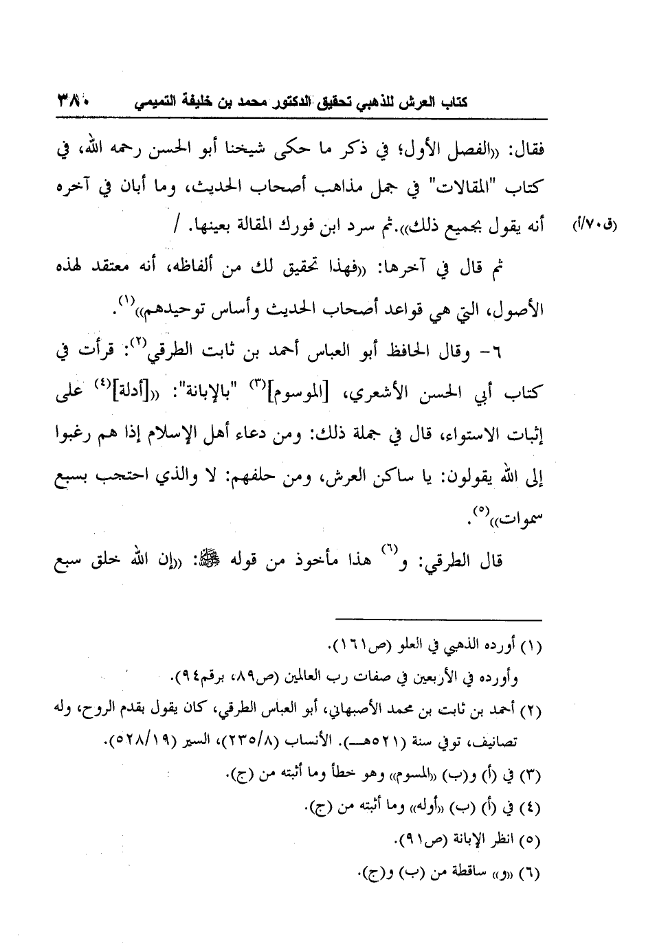 6- وقال الحافظ أبو العباس أحمد بن ثابت الطرقي2: قرأت في كتاب أبي الحسن الأشعري، [الموسوم] 3 "بالإبانة": " [أدلة] 4 على إثبات الاستواء، قال في جملة ذلك: ومن دعاء أهل الإسلام إذا هم رغبوا إلى الله يقولون: يا ساكن العرش، ومن حلفهم: لا والذي احتجب بسبع سموات"5.