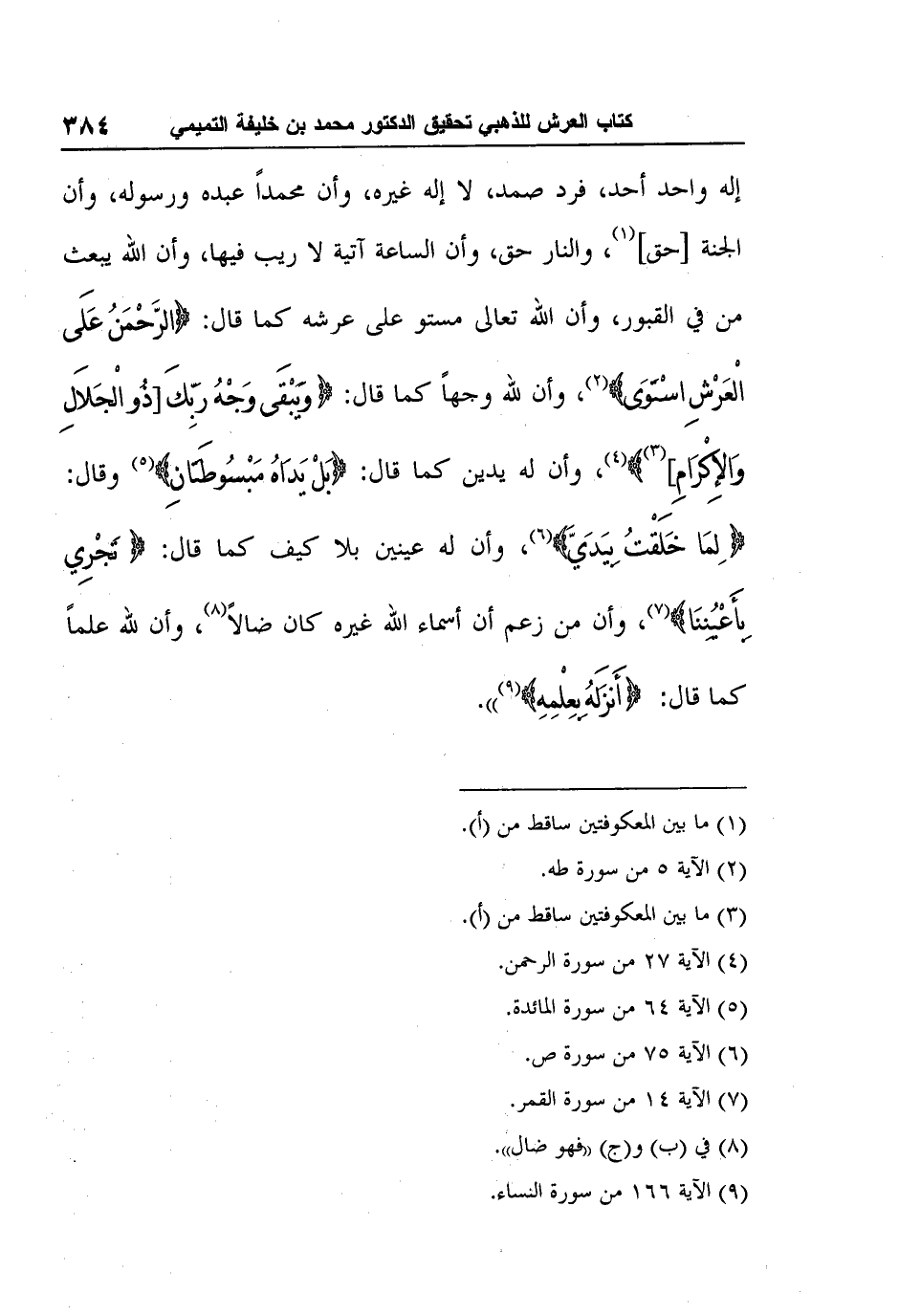 إله واحد أحد، فرد صمد، لا إله غيره، وأن محمداً عبده ورسوله، وأن الجنة [حق] 1، والنار حق، وأن الساعة آتية لا ريب فيها، وأن الله يبعث من في القبور، وأن الله تعالى مستو على عرشه كما قال: {الرَّحْمَنُ عَلَى الْعَرْشِ اسْتَوَى} 2، وأن لله وجهاً كما قال: {وَيَبْقَى وَجْهُ رَبِّكَ [ذُو الْجَلاَلِ وَالإِكْرَامِ] 3} 4، وأن له يدين كما قال: {بَلْ يَدَاهُ مَبْسُوطَتَانِ} 5 وقال: {لِمَا خَلَقْتُ بِيَدَيَّ} 6، وأن له عينين بلا كيف كما قال: {تَجْرِي بِأَعْيُنِنَا} 7، وأن من زعم أن أسماء الله غيره كان ضالاً8، وأن لله علماً كما قال: {أَنزَلَهُ بِعِلْمِهِ} 9".